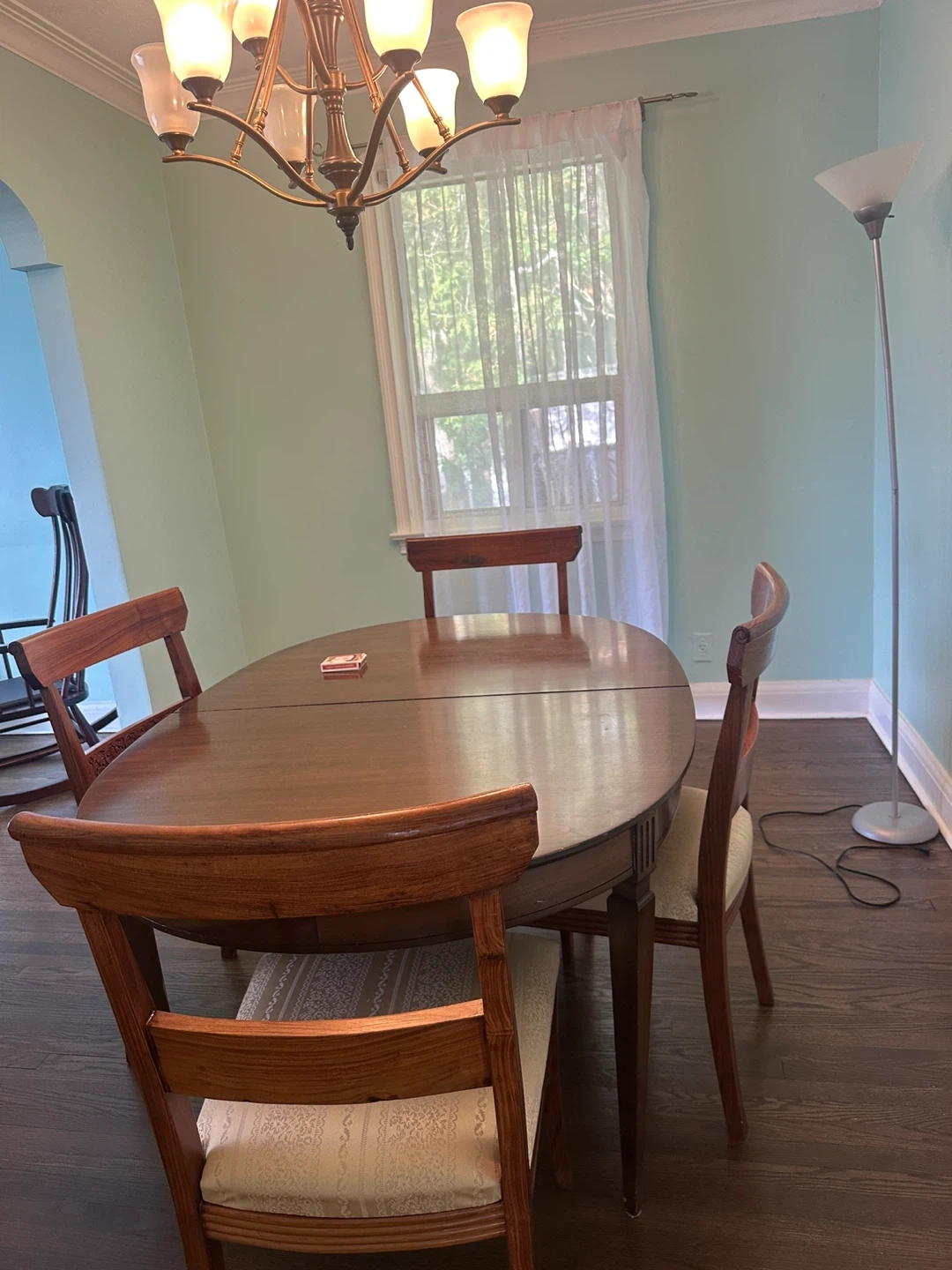 Selling a dining table with four chairs! It's a lovely set that would look great in any home. The table appears to be in good condition. Perfect for family dinners or gatherings with friends