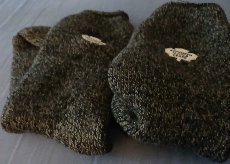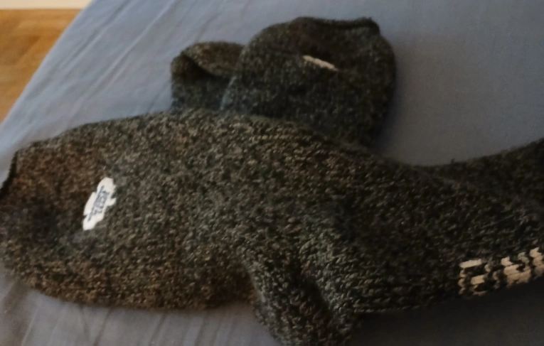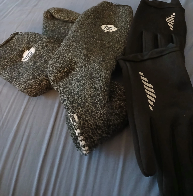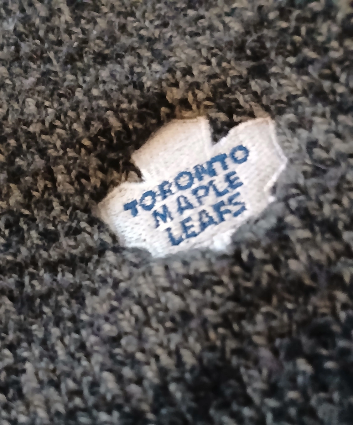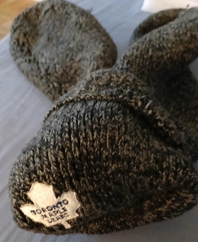 Selling a set of Toronto Maple Leafs socks and black gloves. The socks are grey and knitted, featuring the team logo. The gloves are black with a striped design on the back of the hand. Perfect for showing your team spirit!