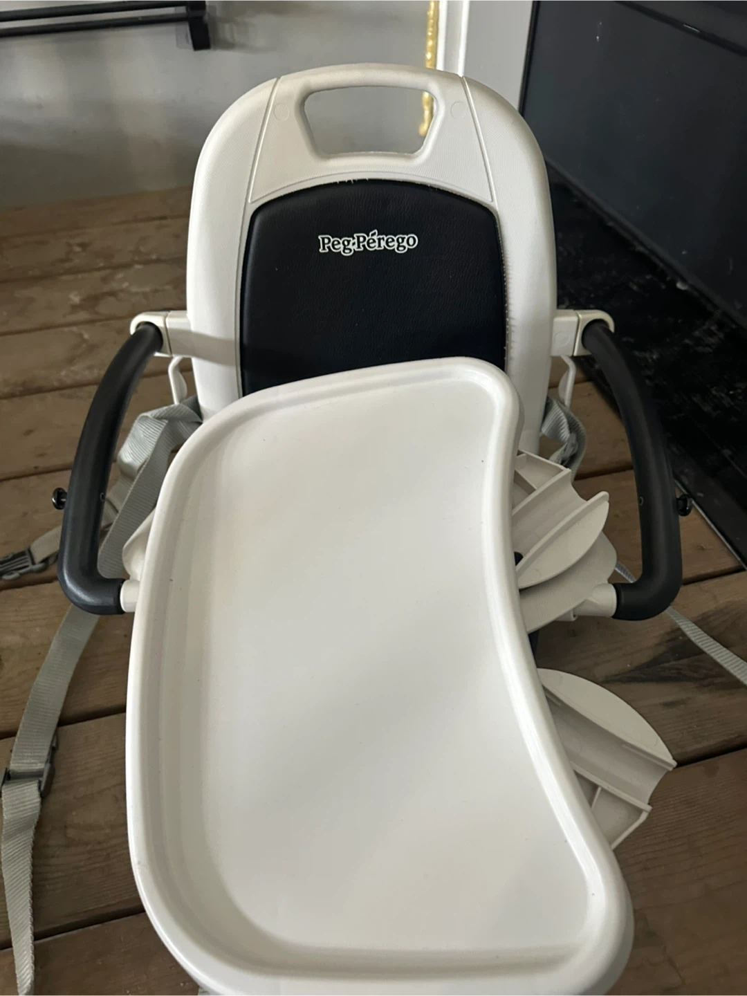 This is a white and black Peg-Pérego booster seat that attaches to a regular chair. It includes a removable tray and adjustable straps for securing your child. It's great for making any chair a high chair.
