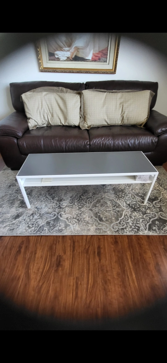 Selling a coffee table with a white frame and grey top. It's in good condition and would be a great addition to any living room