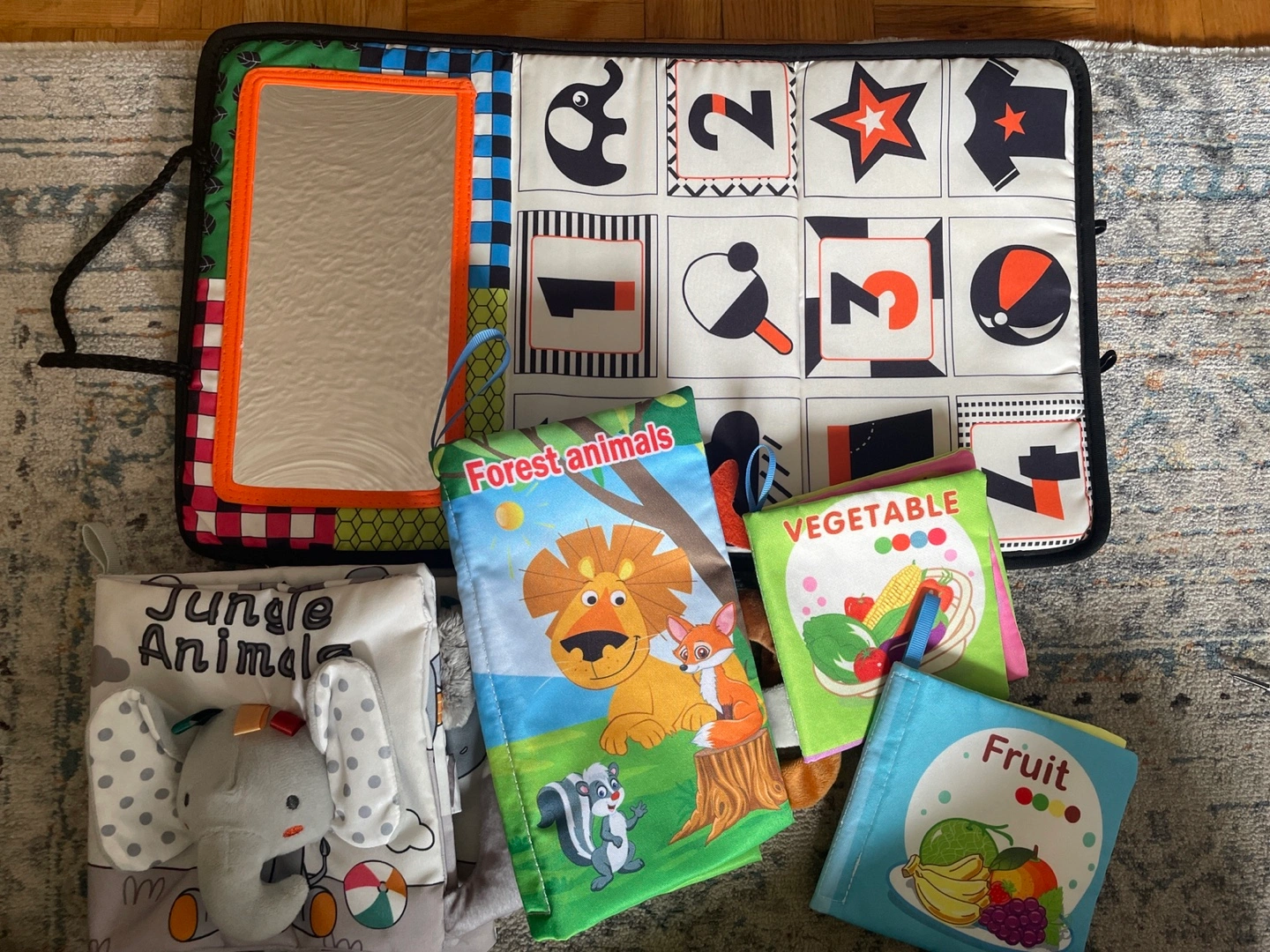 This Wee Gallery activity gym is perfect for tummy time and early development! It comes with four soft books featuring colourful illustrations of animals, fruits, and vegetables. The gym also includes a baby-safe mirror for self-discovery. It's in great condition and ready for a new little one to enjoy
