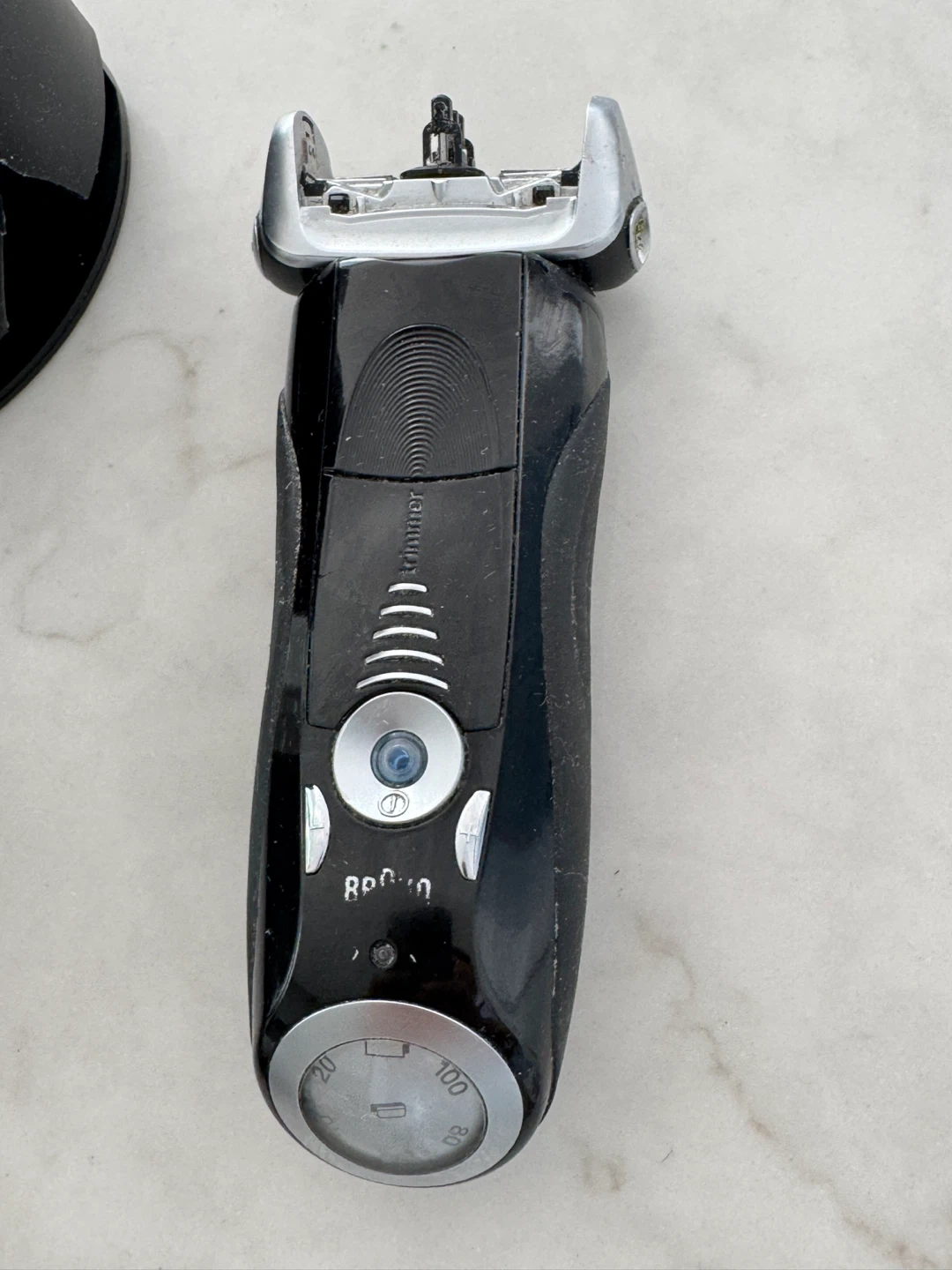 Selling a Braun Series 7 electric shaver in black. It comes with the charging station and power cord. It's in good working condition and ready for a new home! without the head.