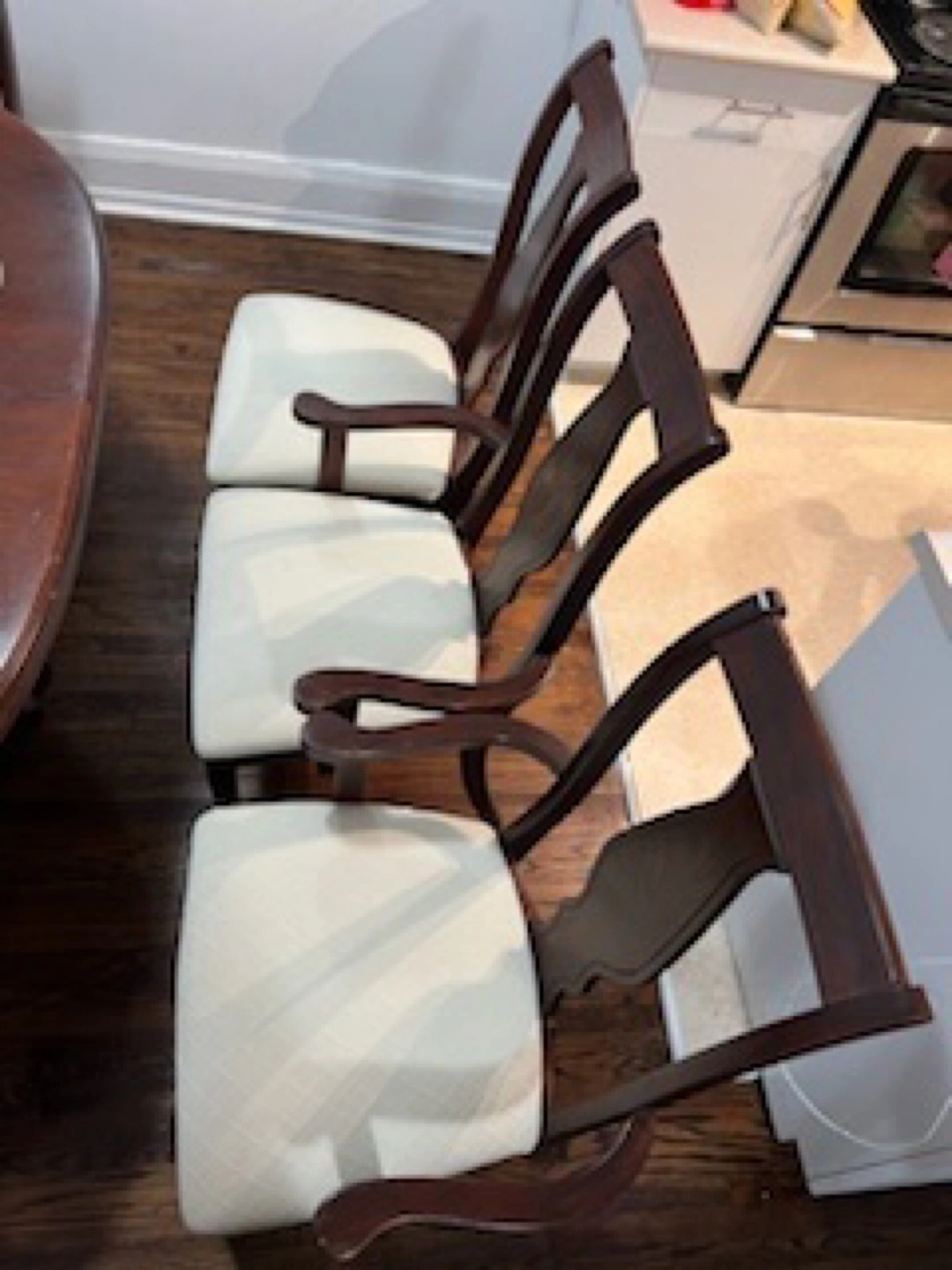 Selling a lovely dining table set in a cherry wood finish! It comes with chairs, including two captains chairs). The table and chairs are made of wood (tabletop is heavy duty plywood with real wood veneer) and have a classic design. The chair seats are upholstered in a neutral fabric. It's a great set for family dinners or entertaining guests.