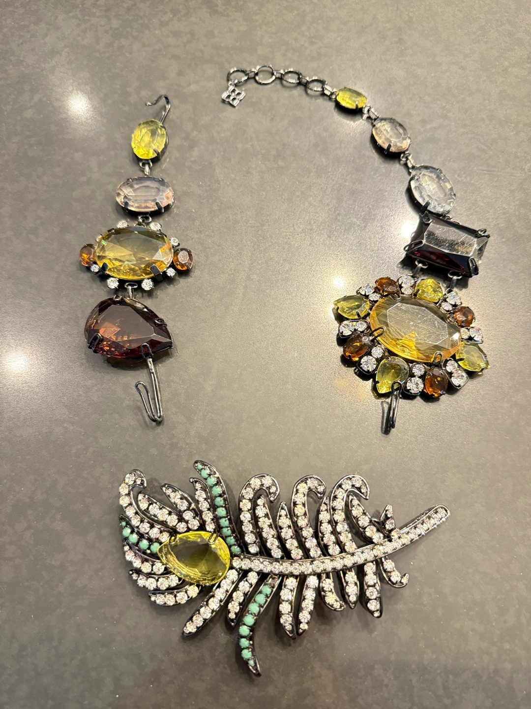 This is a stunning statement necklace featuring a variety of gemstones in different shapes and colours. It has a unique feather design element with sparkling accents.