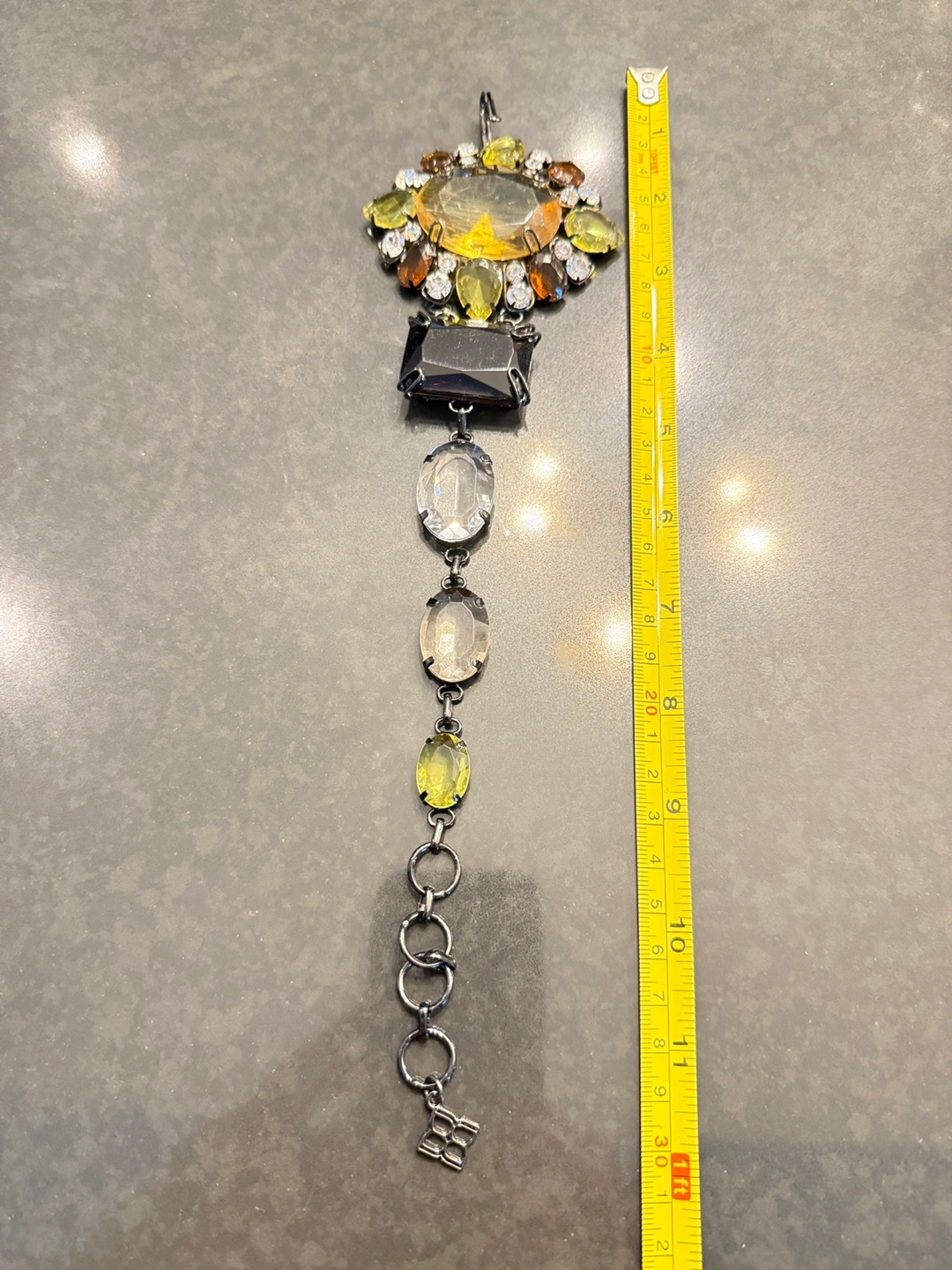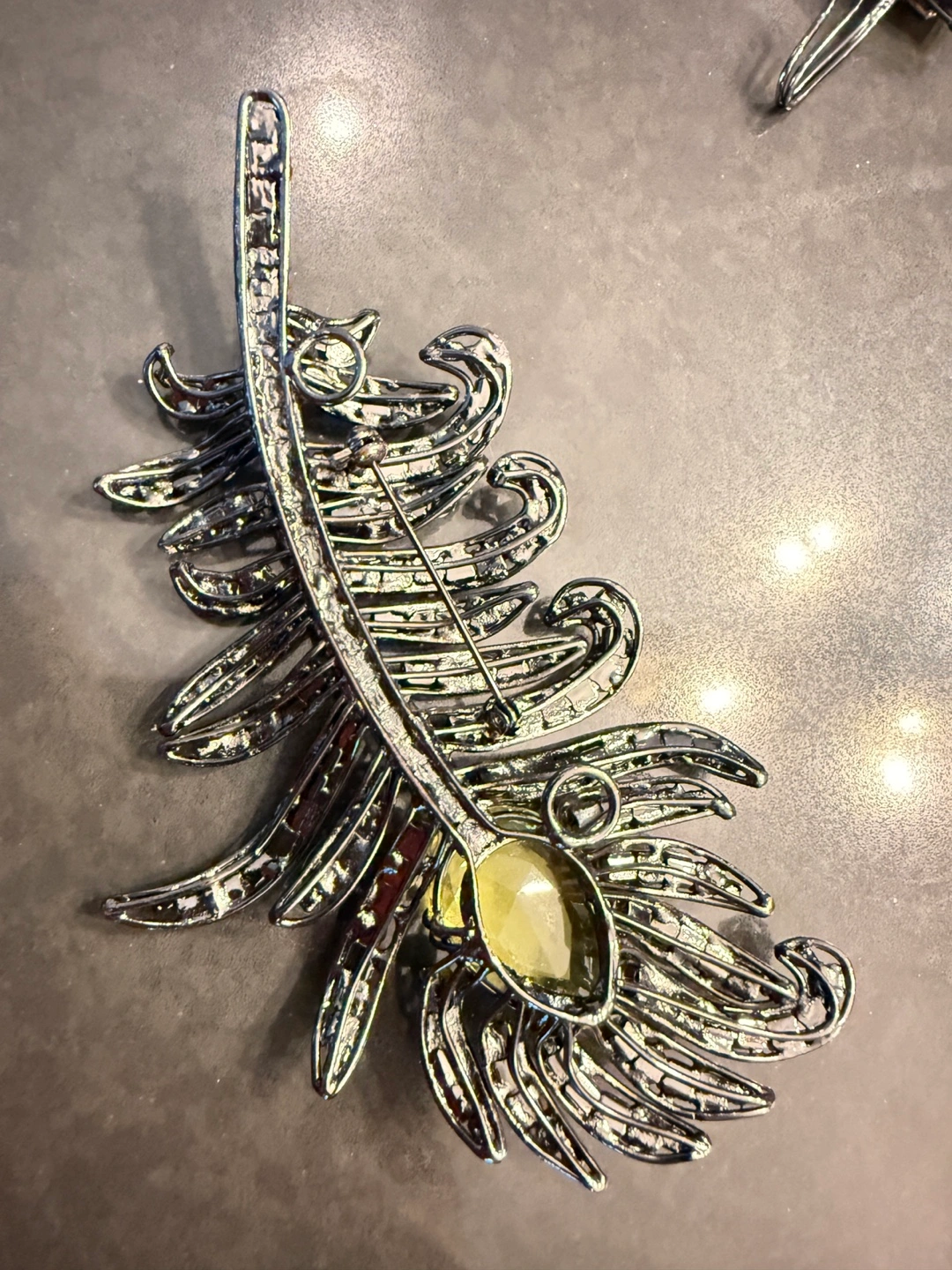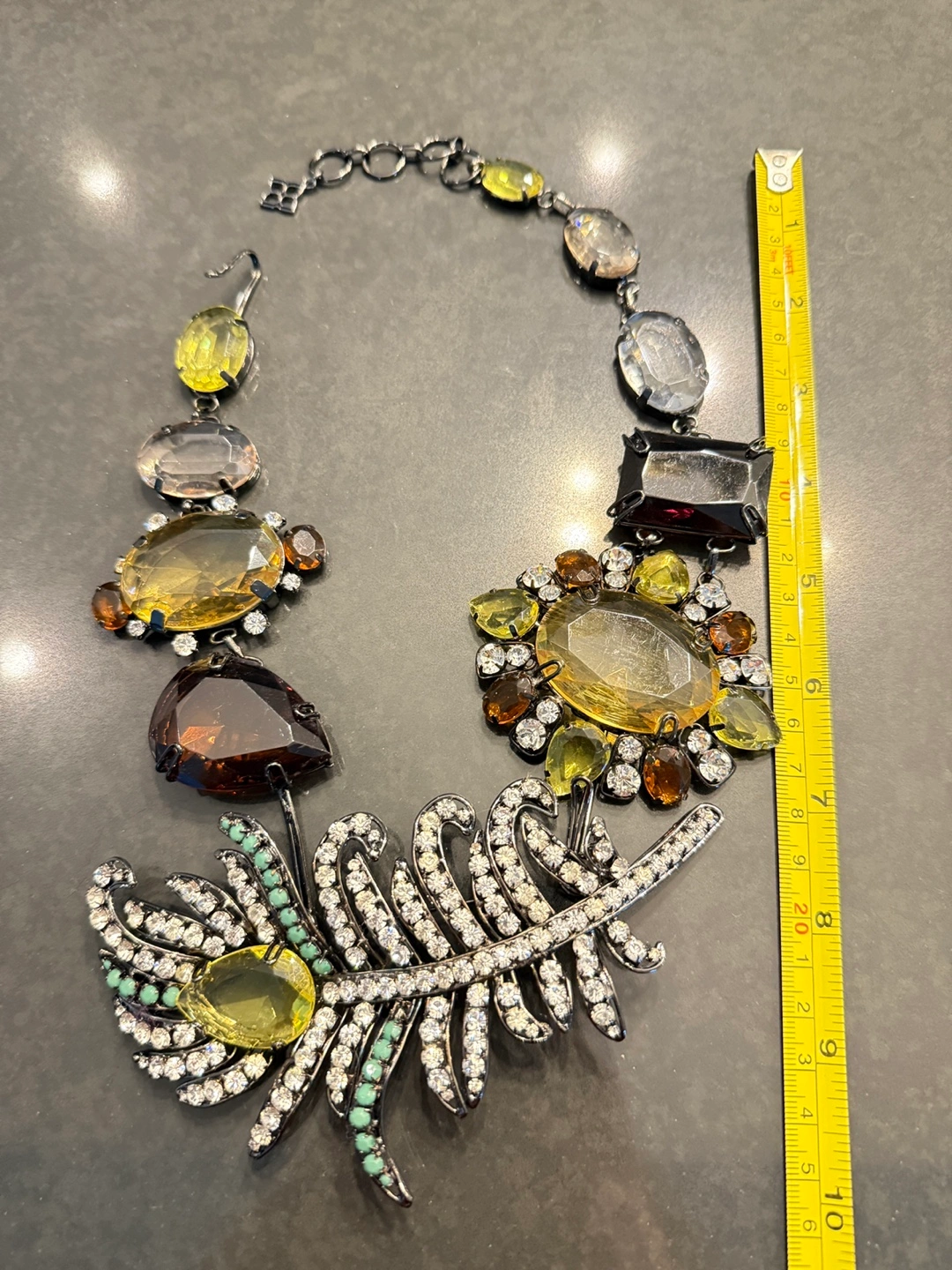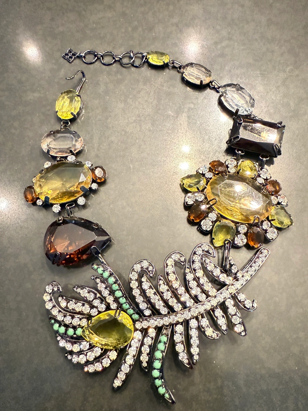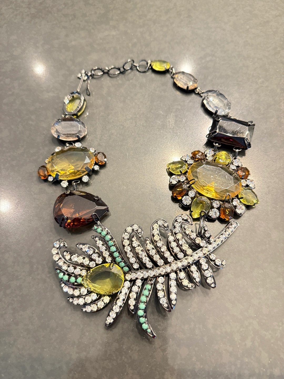 This is a stunning statement necklace featuring a variety of gemstones in different shapes and colours. It has a unique feather design element with sparkling accents.