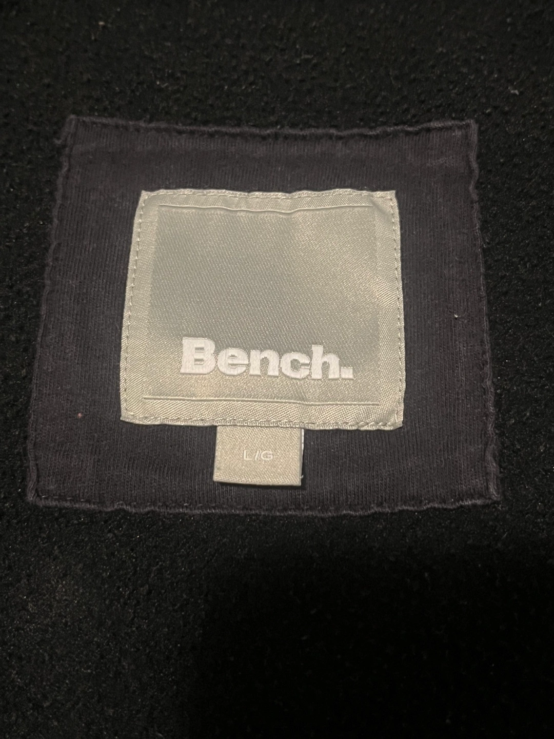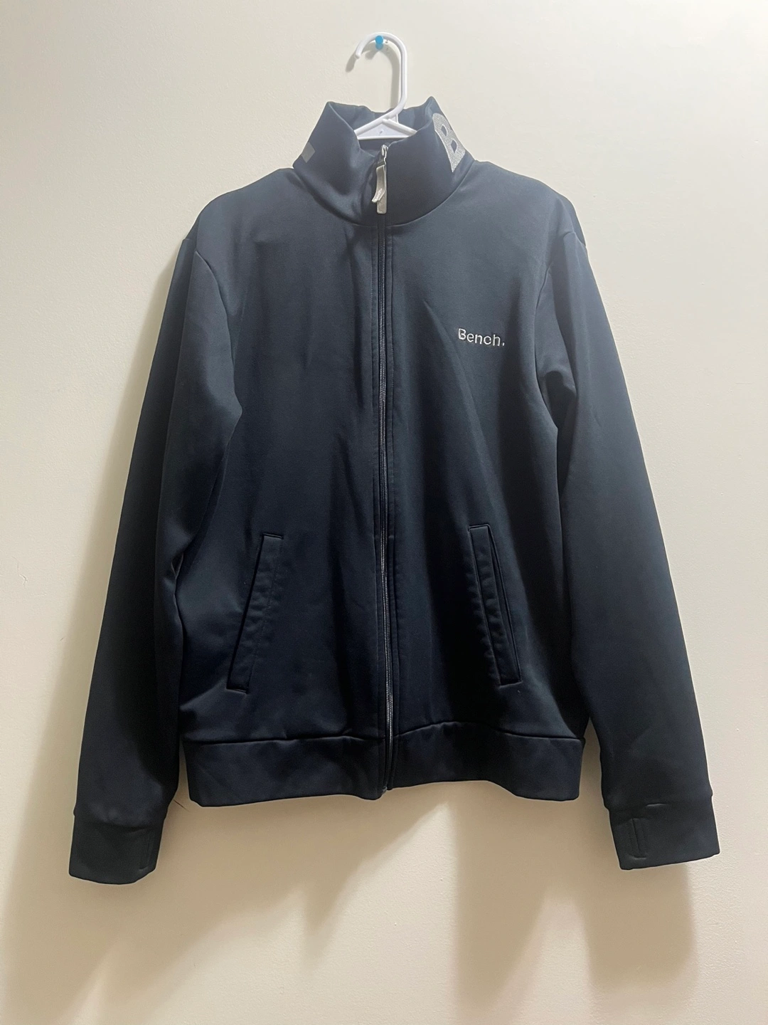 Black jacket by Bench. Features zip closure and side pockets, as well as thumb holes.
