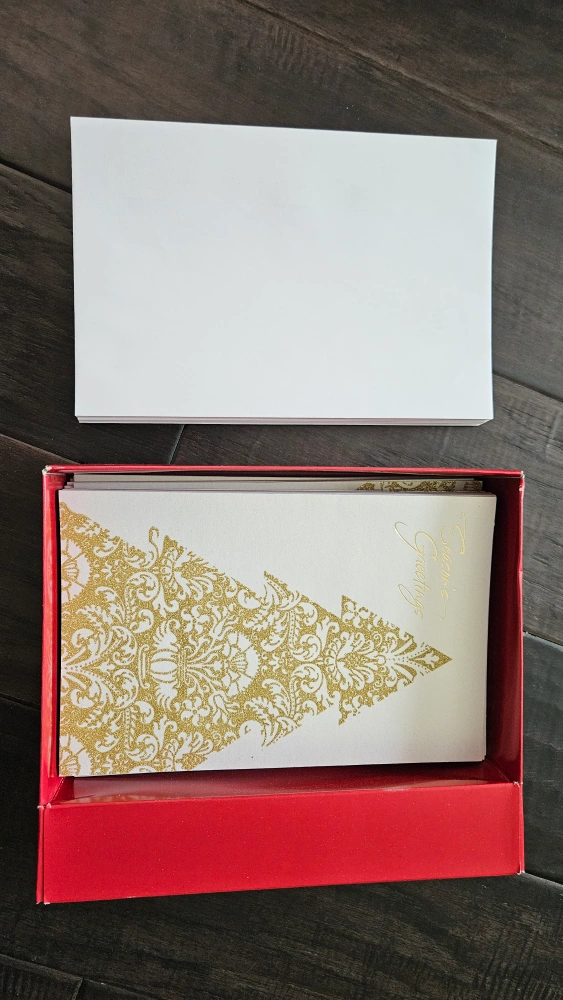 Set of Christmas greeting cards, complete with a box and envelopes! The cards feature a lovely gold Christmas tree design. Perfect for sending holiday wishes to friends and family this season. 28 cards included