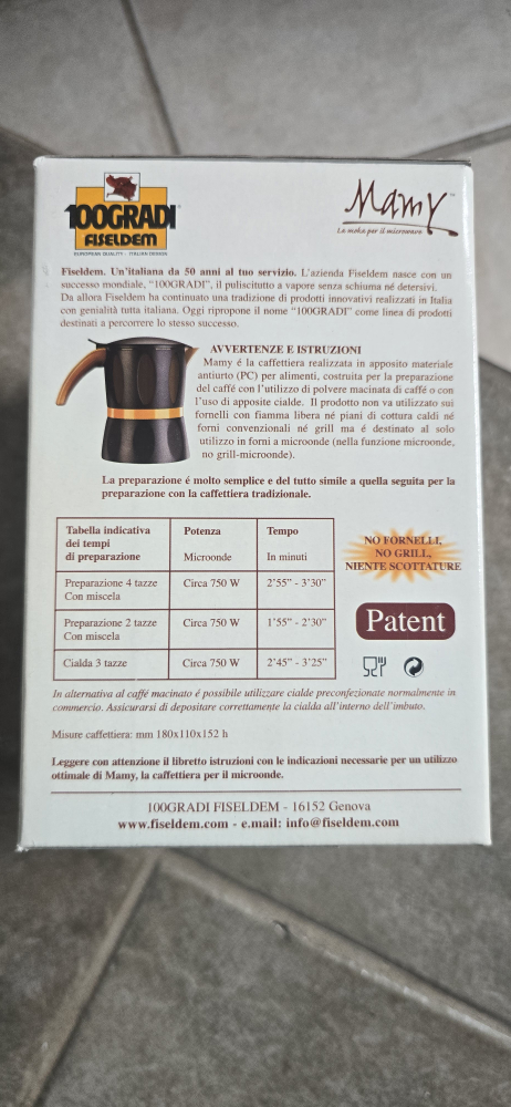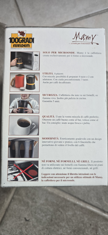 BRAND NEW ..Selling a 100GRADI Fiseldom Mamy Moka pot. It's designed for microwave use. The box says it's suitable for preparing 4 cups or 2 cups with adapters, and even for decaffeinated coffee. A nice addition to your kitchen!
