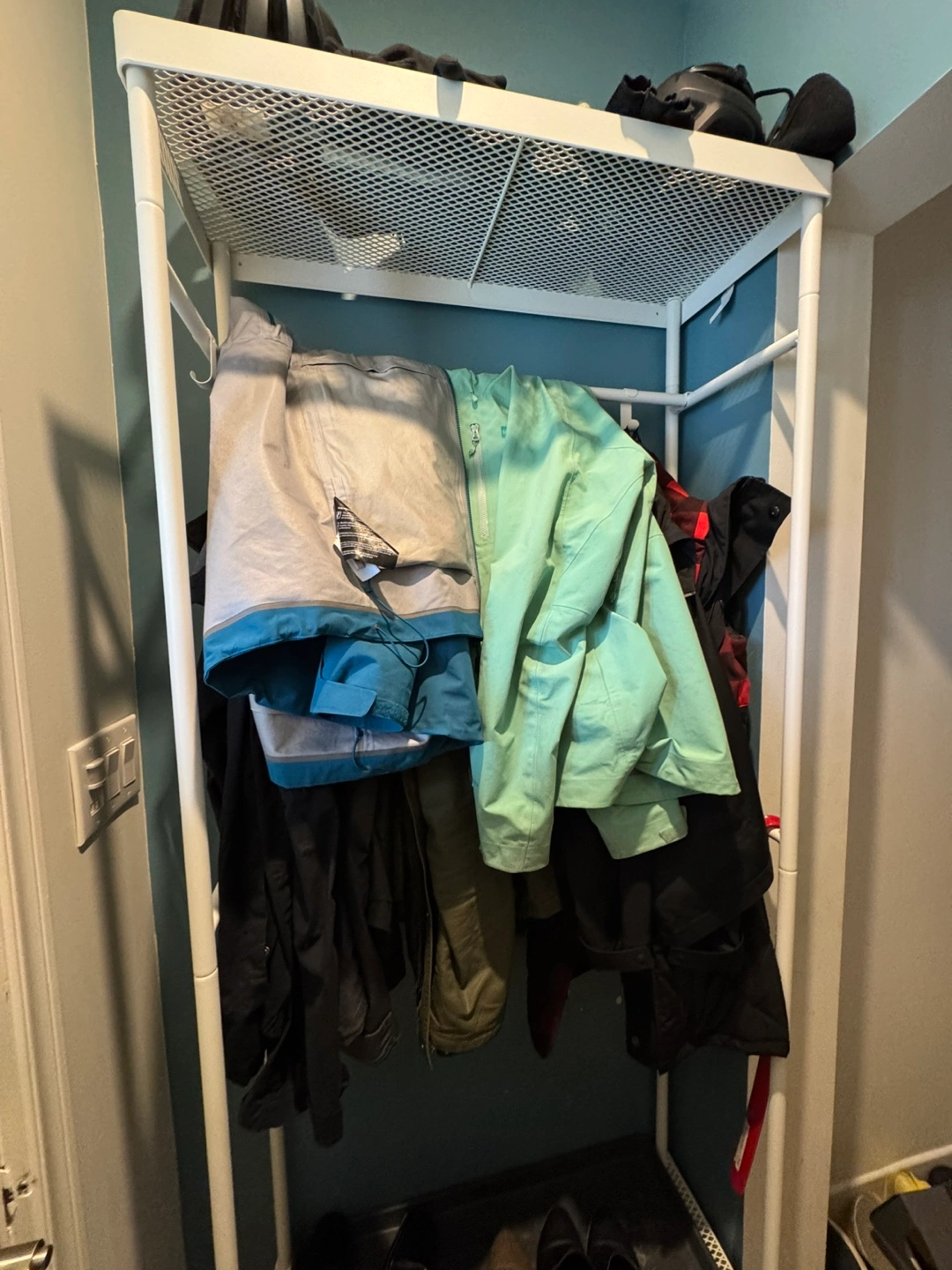 Selling an IKEA MACKAPÄR coat rack system in white. It's a great way to organize jackets and shoes by your front (or back) door. This unit offers plenty of hooks for coats, as well as two shelves for shoes.