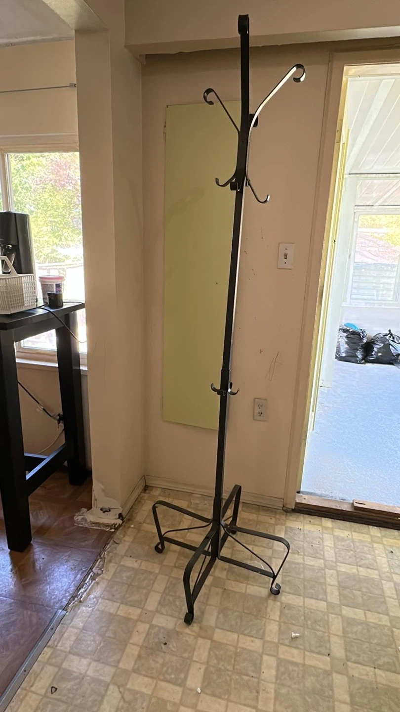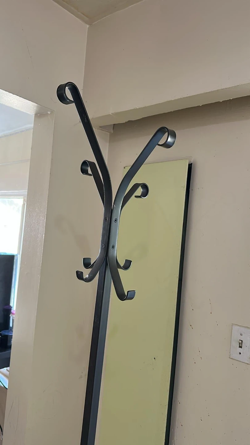 Selling a black metal coat rack stand. It's in good condition and ready to hold your coats and hats! Perfect for entryways or hallways to keep things organized. It features multiple hooks for hanging items and a sturdy base for stability