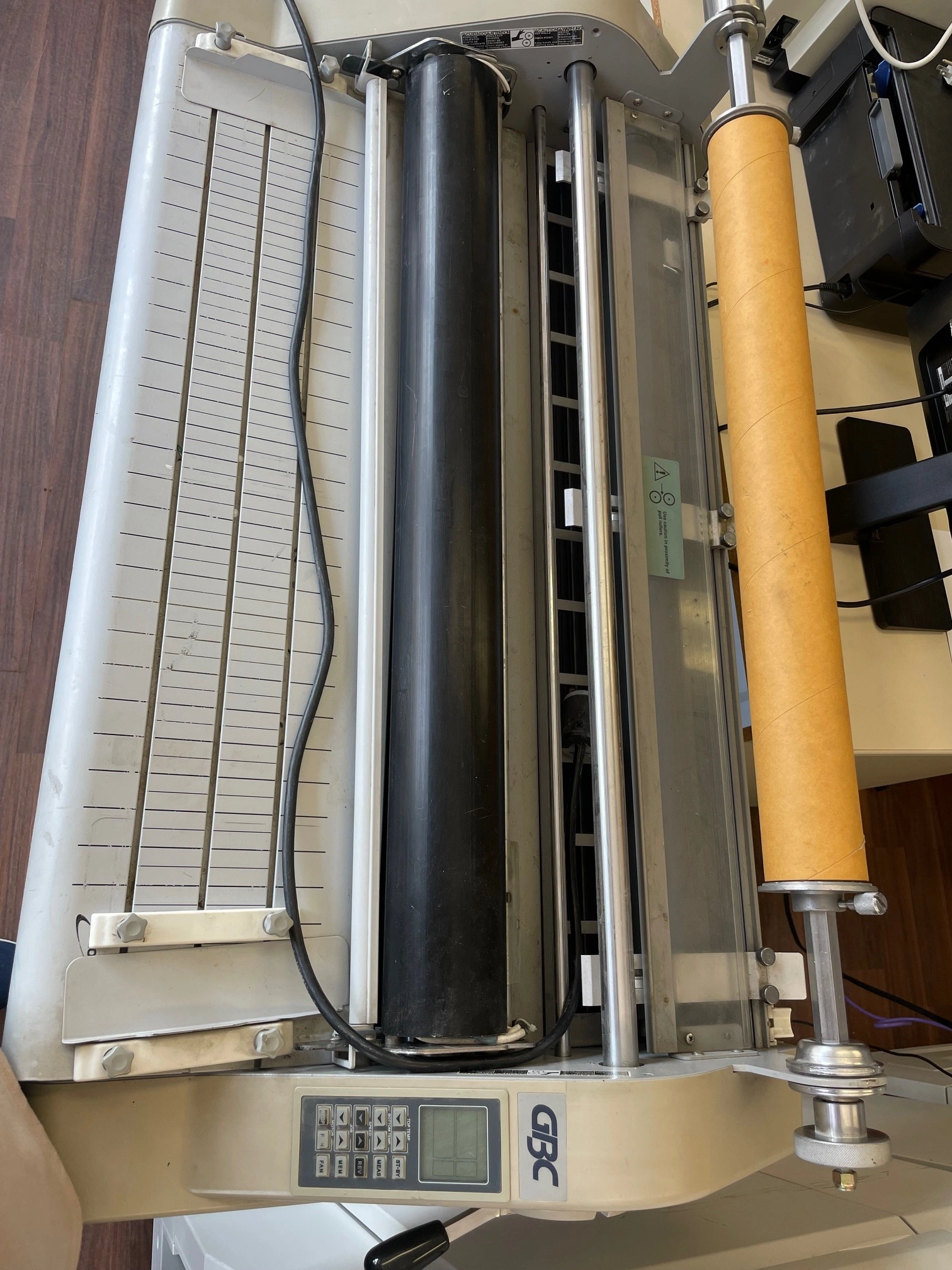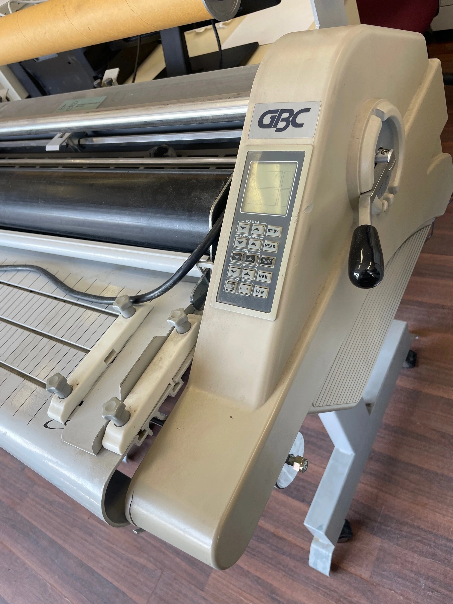 Laminate at amazing speeds with GBC Discovery 80 High Speed 31" Laminator. The laminator is designed to meet the needs of commercial printing and in-house production environments. It can laminate at speeds of up to 20' per minute or four times faster than most office laminators. It can accommodate posters up to 31" wide or two-up 12" x 18" sheets and handles roll up to 2000 feet for continuous operation. Crowned rollers and infrared heating systems ensure consistent professional-level output is maintained even at-8 higher speeds. An easy-to-read LCD panel displays temperature, speed, job settings, and ready and wait-for controls. Memory function conveniently saves and recalls up to nine different set-up positions for speed and temperature. Roll Laminator Description