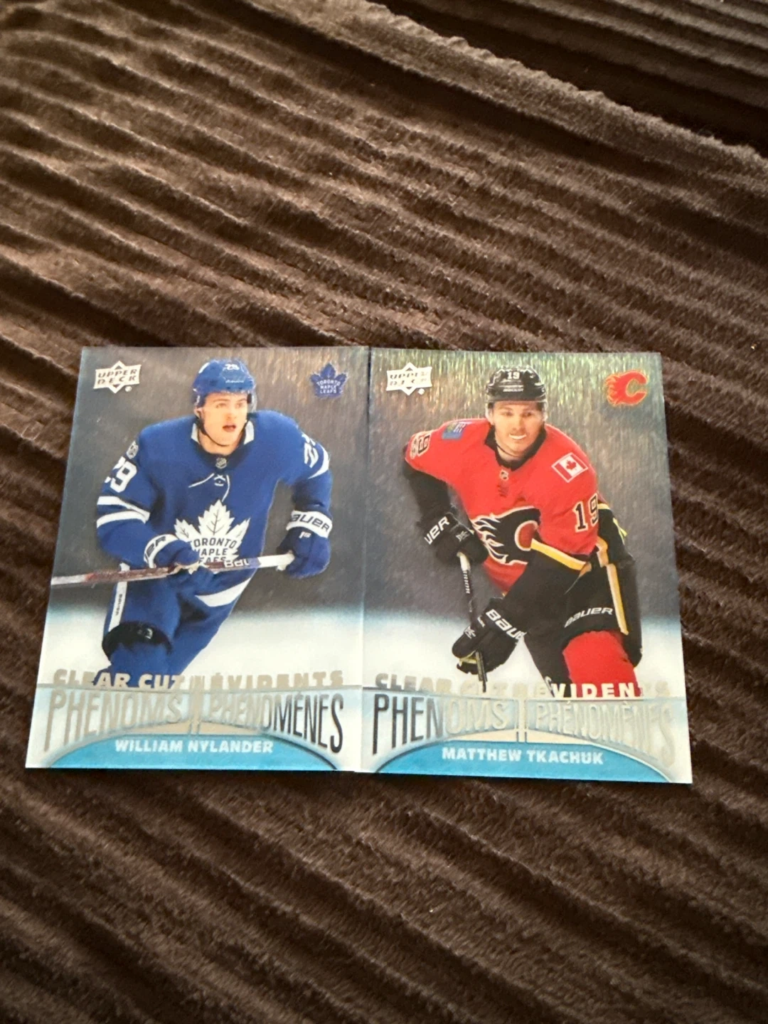 Selling a pair of Upper Deck hockey cards featuring William Nylander of the Toronto Maple Leafs and Matthew Tkachuk of the Calgary Flames. A great addition for any hockey card collector!