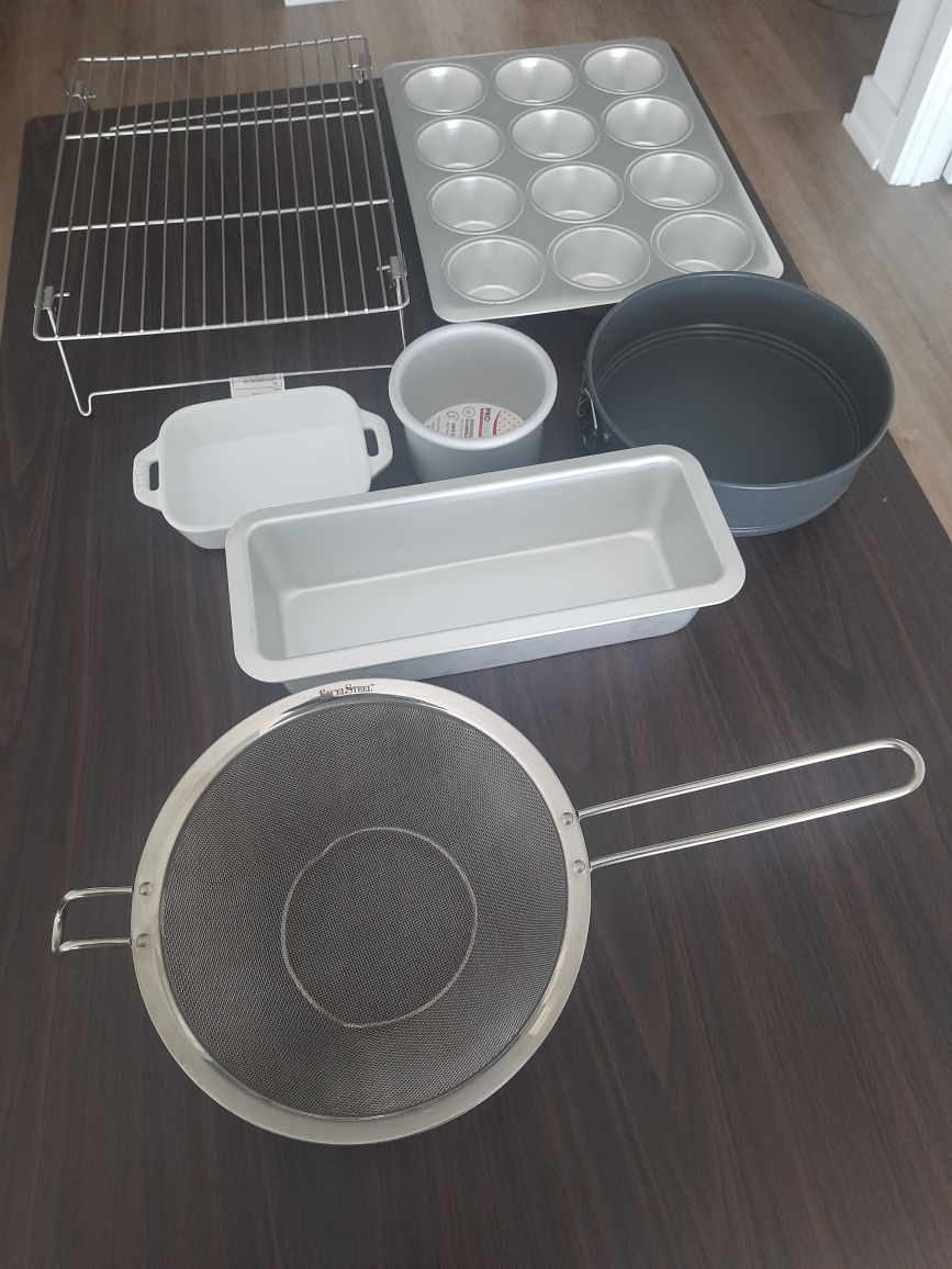 Selling a collection of baking essentials! Includes a baking rack, muffin tin, small casserole dish, small round cake pan, large loaf pan, large strainer, and a dark non-stick cake pan. Great for anyone who loves to bake or is just starting out!