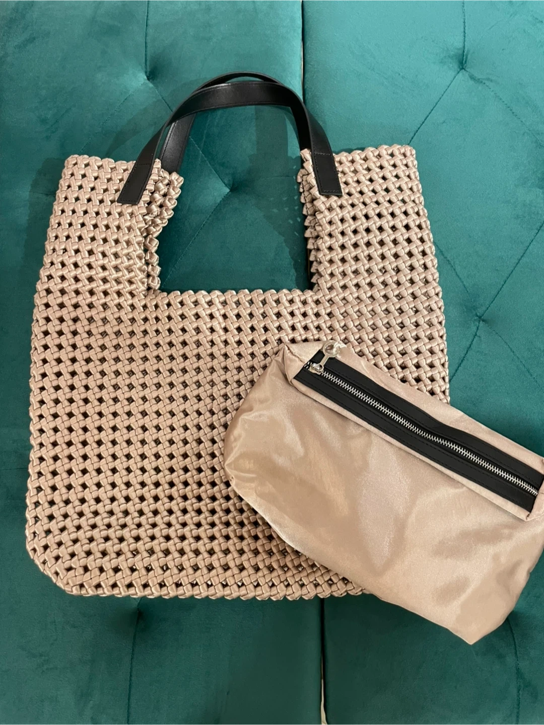Selling a stylish woven tote bag! It comes with a matching pouch, perfect for keeping your essentials organized. The woven design gives it a unique and trendy look, great for everyday use or a day out shopping