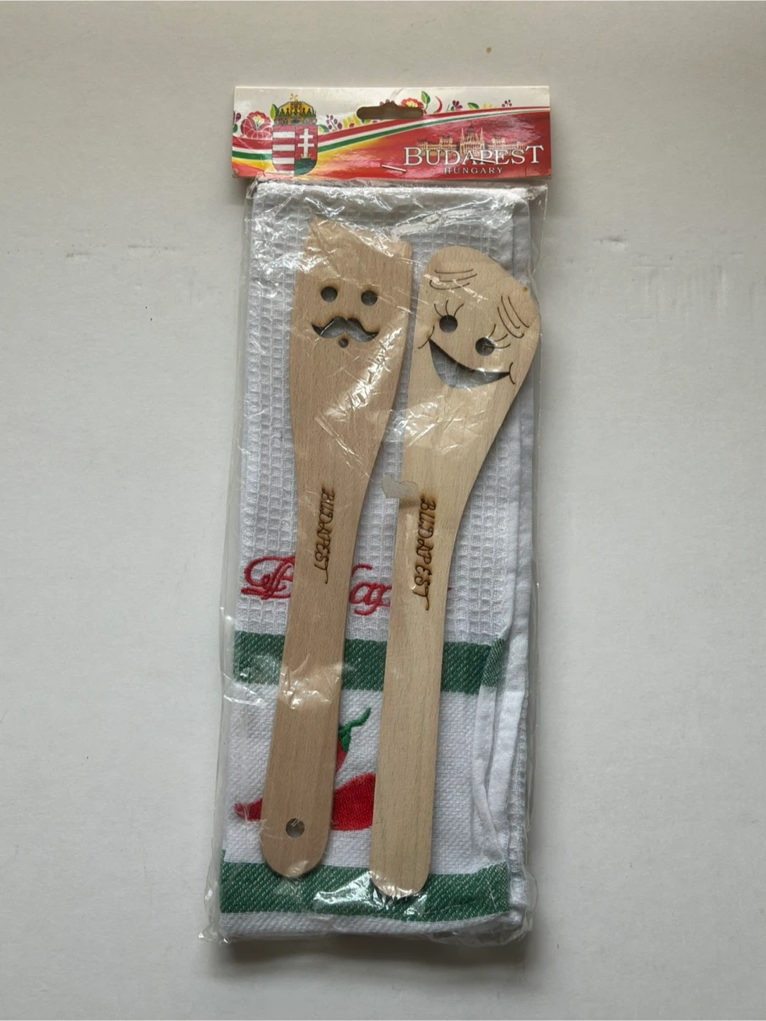 New, unopened set of wooden spoons and a tea towel from Budapest! The spoons have cute face designs, and the towel features an embroidered design. Perfect as a souvenir or a fun addition to your kitchen