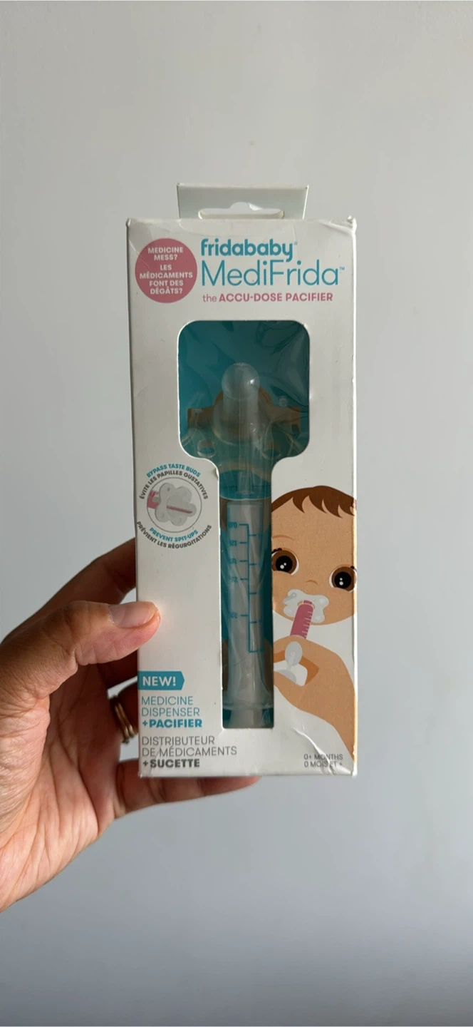 Selling a FridaBaby MediFrida Accu-Dose Pacifier! It's a medicine dispenser and pacifier in one, designed to deliver the right dose without the mess. The pacifier helps bypass taste buds and prevent spit-ups. Perfect for babies 0+ months Never used. Never opened.