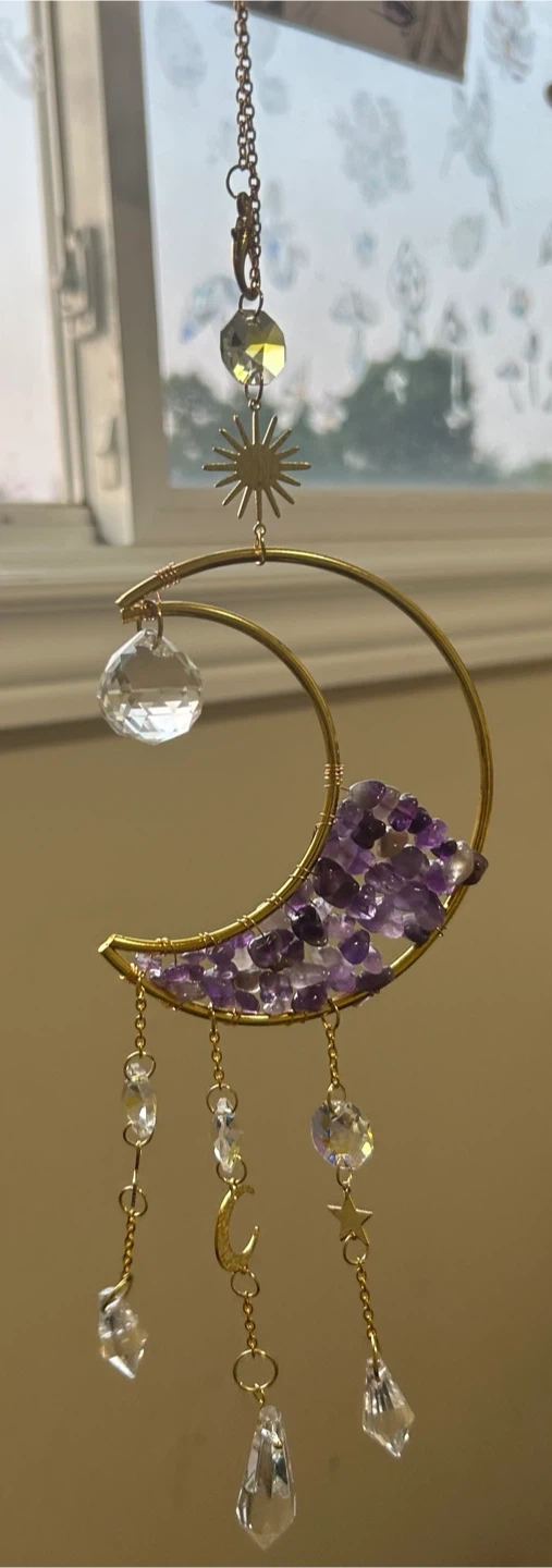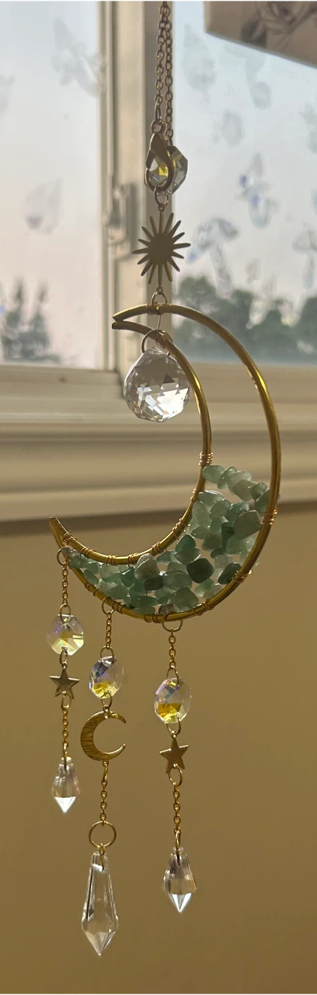 Add a touch of magic to your space with this beautiful crystal moon sun catcher! It features a crescent moon design filled with amethyst or green aventurine crystals, a sun charm, and sparkling crystal pendants. Perfect for hanging in a window to catch the light and create a dreamy atmosphere