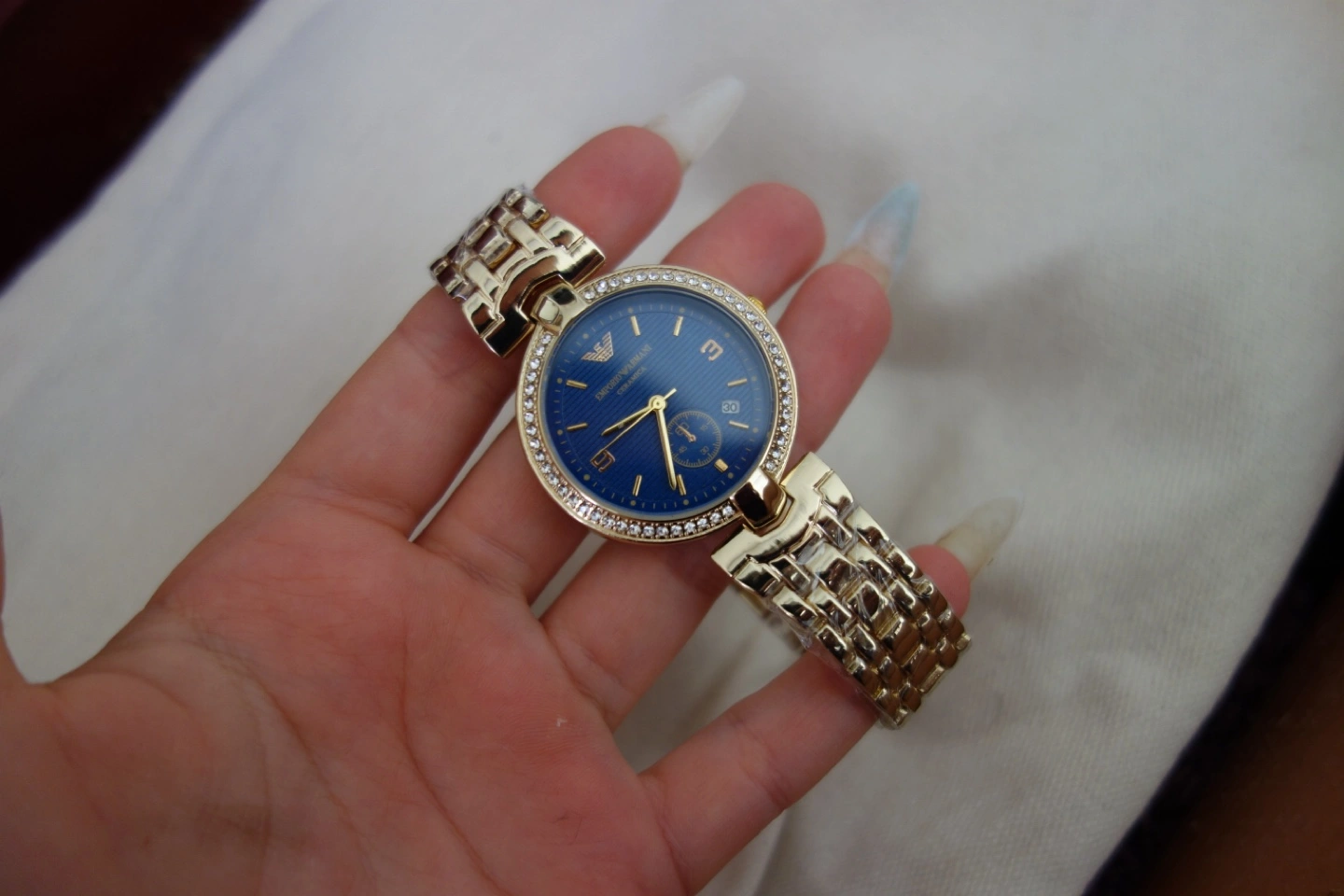 This is a beautiful Emporio Armani ladies watch. It features a gold-tone stainless steel band and a striking blue dial with crystal accents. The watch is in great condition and ready to wear!