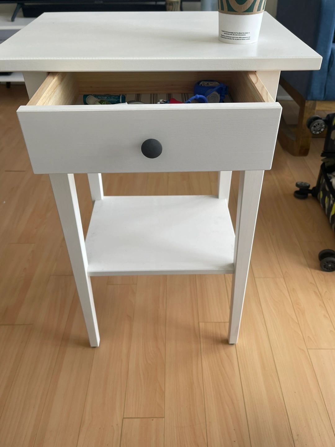 A cute little white bedside table! It has a drawer and a shelf, perfect for storing books or your phone. It's in good condition and ready for a new home