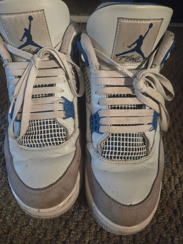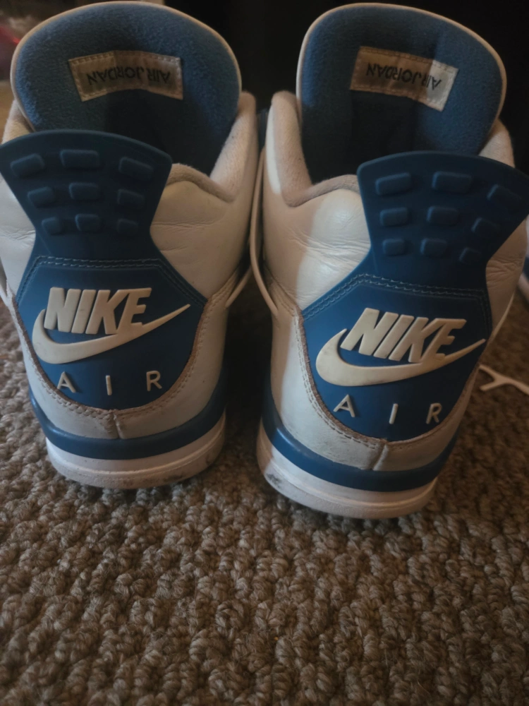 Selling a pair of Air Jordan 4 Retro shoes in white and blue. They show some signs of wear, but still have lots of life left!