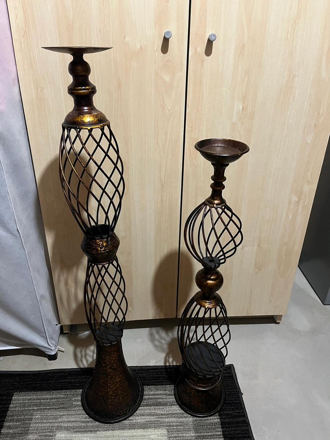 22Selling a pair of decorative metal candle holders. They have an interesting cage-like design with a bronze-gold finish. Perfect for adding a touch of elegance to any room!
