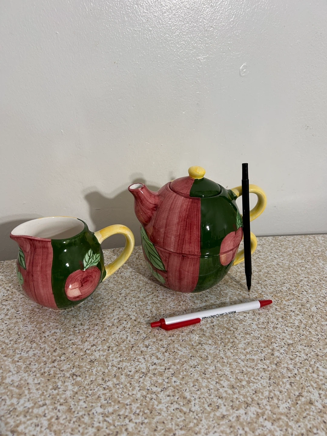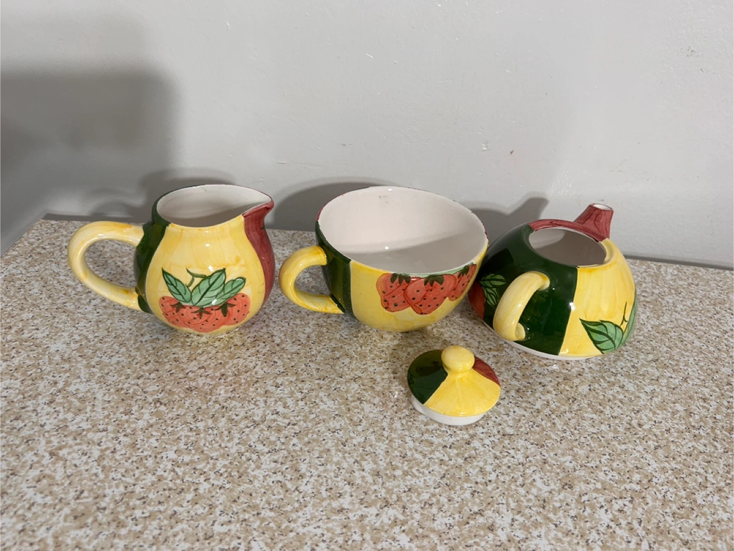 Selling a cute vintage ceramic teapot and creamer set! It has a unique design with strawberries and apples. Perfect for adding a touch of retro charm to your kitchen or tea parties