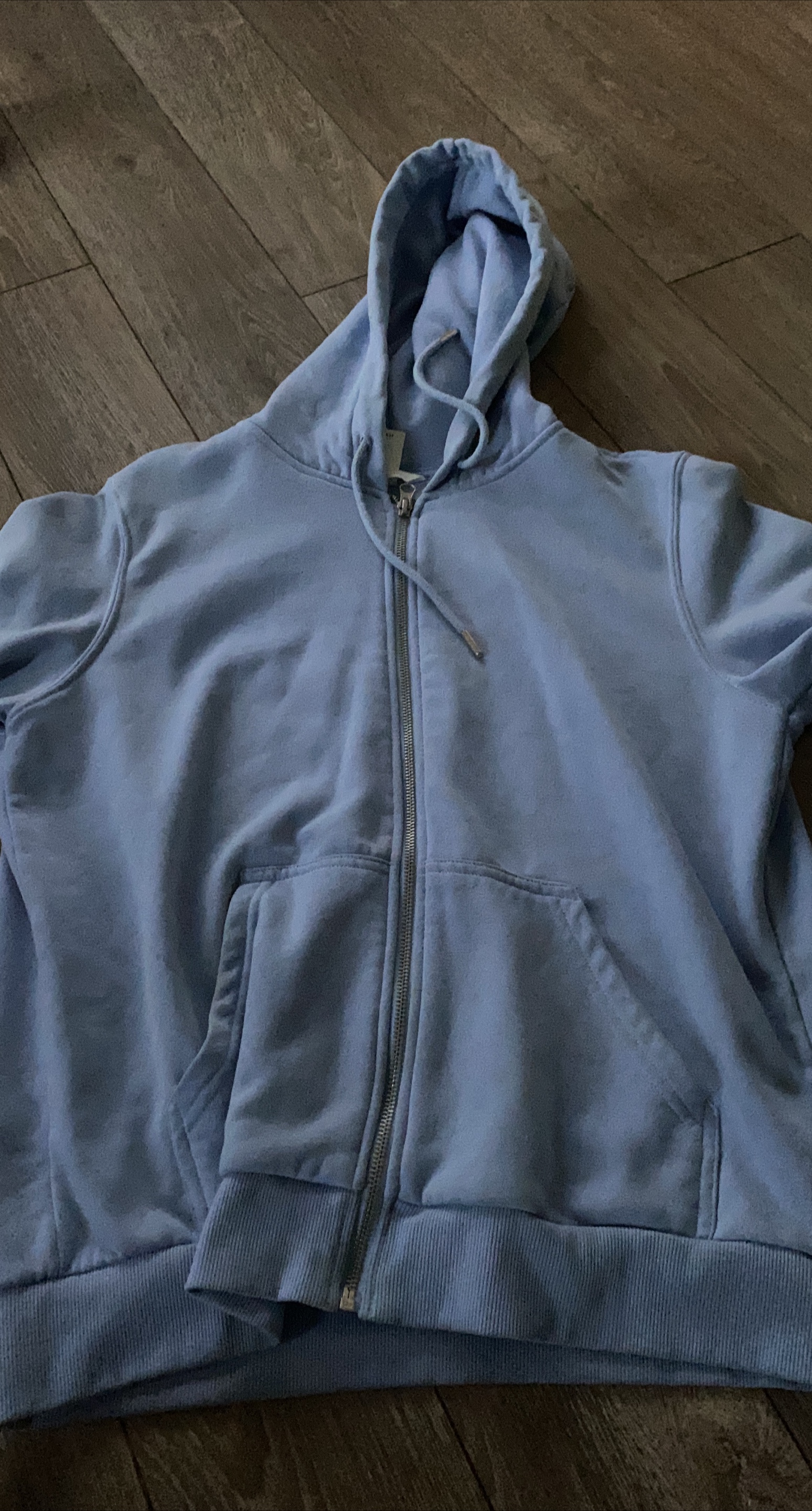 Here's a comfy light blue zip-up hoodie! It has a classic design with a full zipper and convenient front pockets. Perfect for layering or wearing on its own during those cooler Canadian evenings