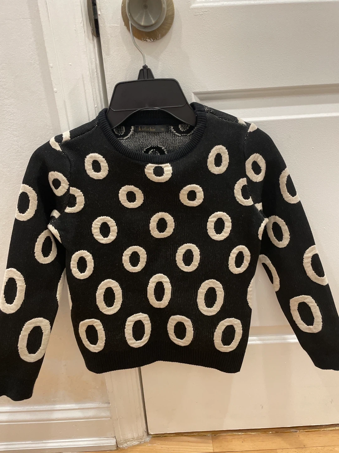 This Kidkichic sweater features a black base with a repeating pattern of white circles. It's a long-sleeved crewneck knit. Made from a soft material for comfort.