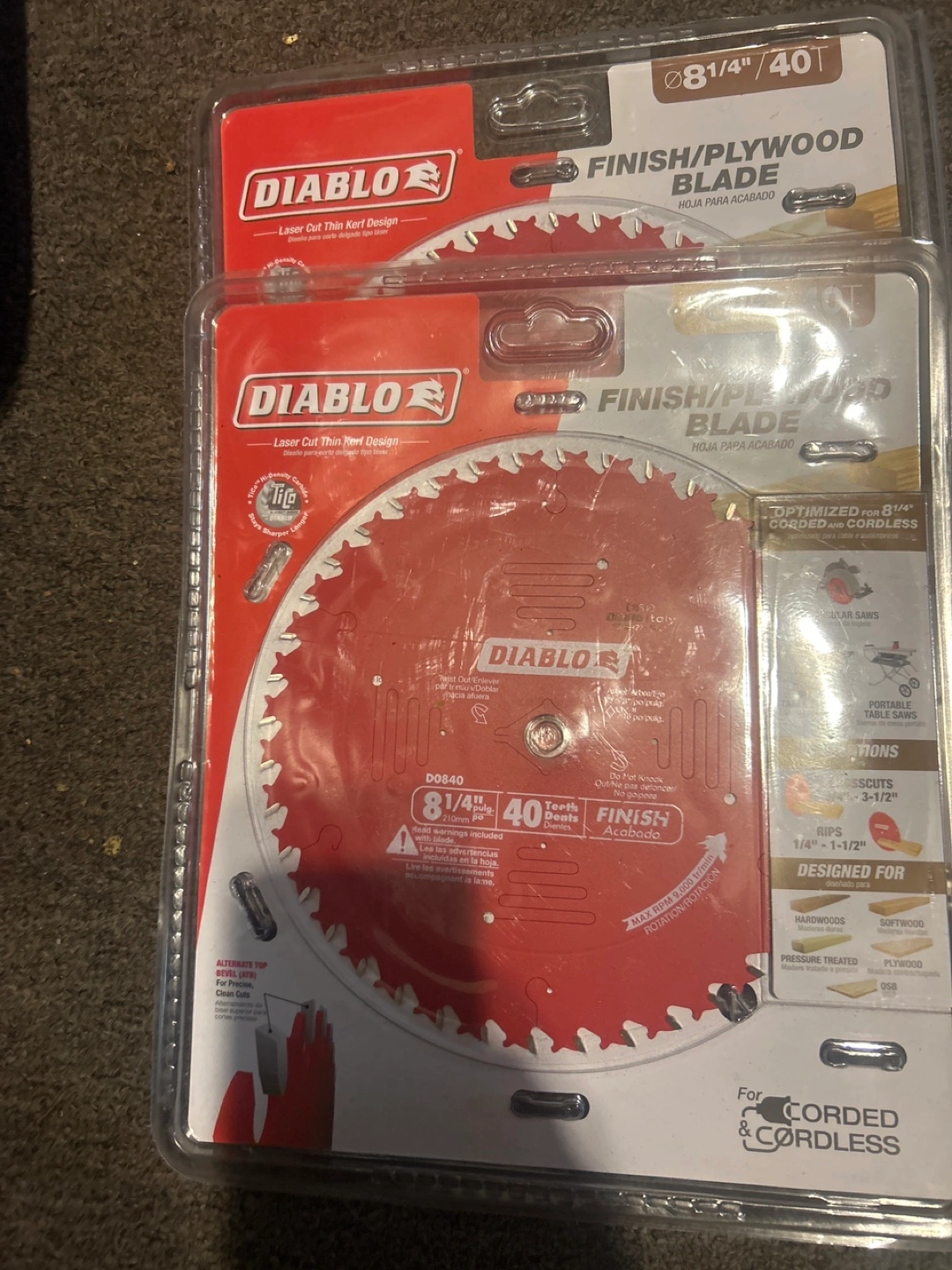 Selling a brand new Diablo 8 1/4" Finish/Plywood Blade. It's optimized for both corded and cordless saws. Designed for hardwoods, softwoods, pressure treated wood, plywood, and OSB. Get precise, clean cuts with this blade!