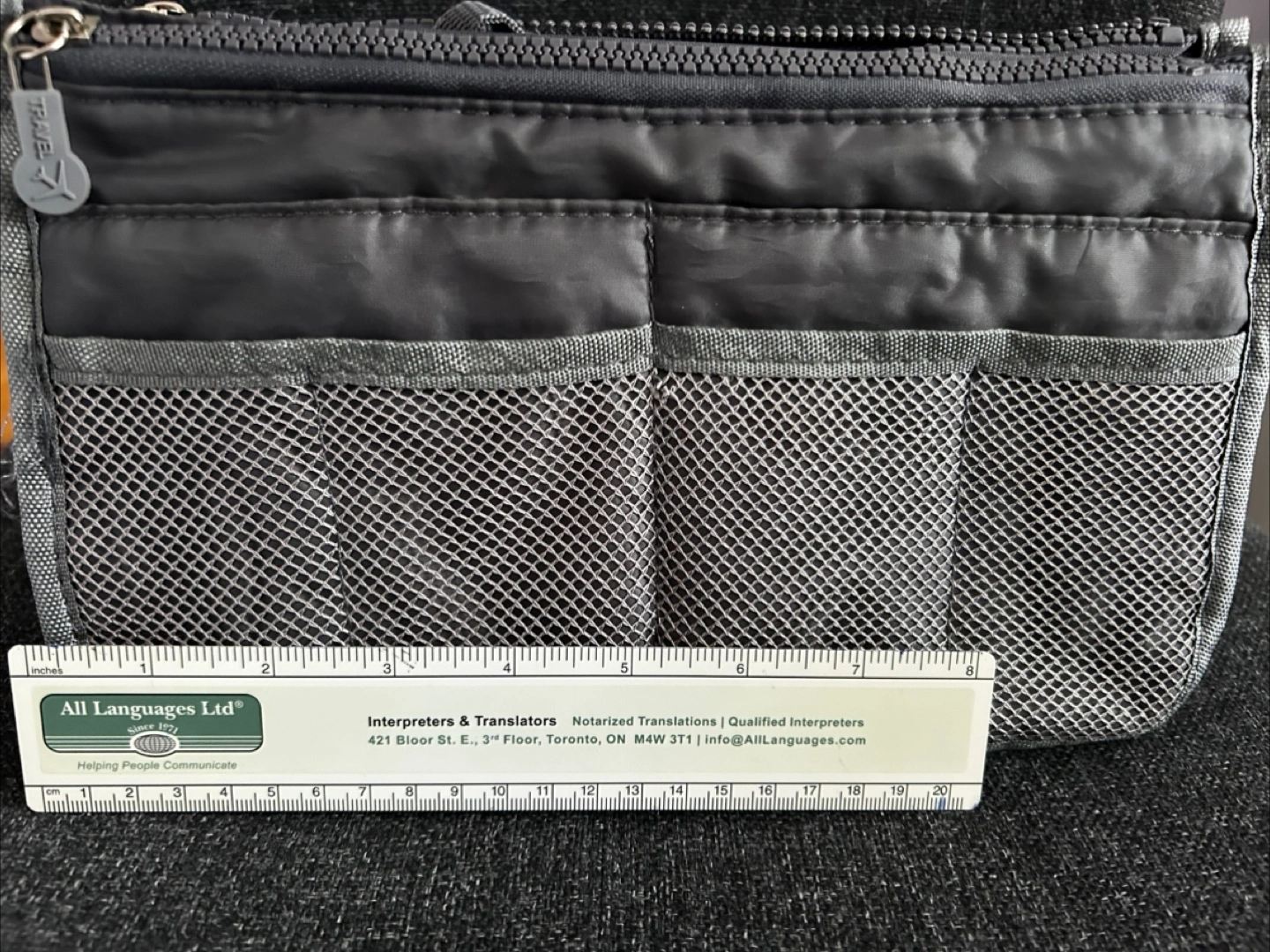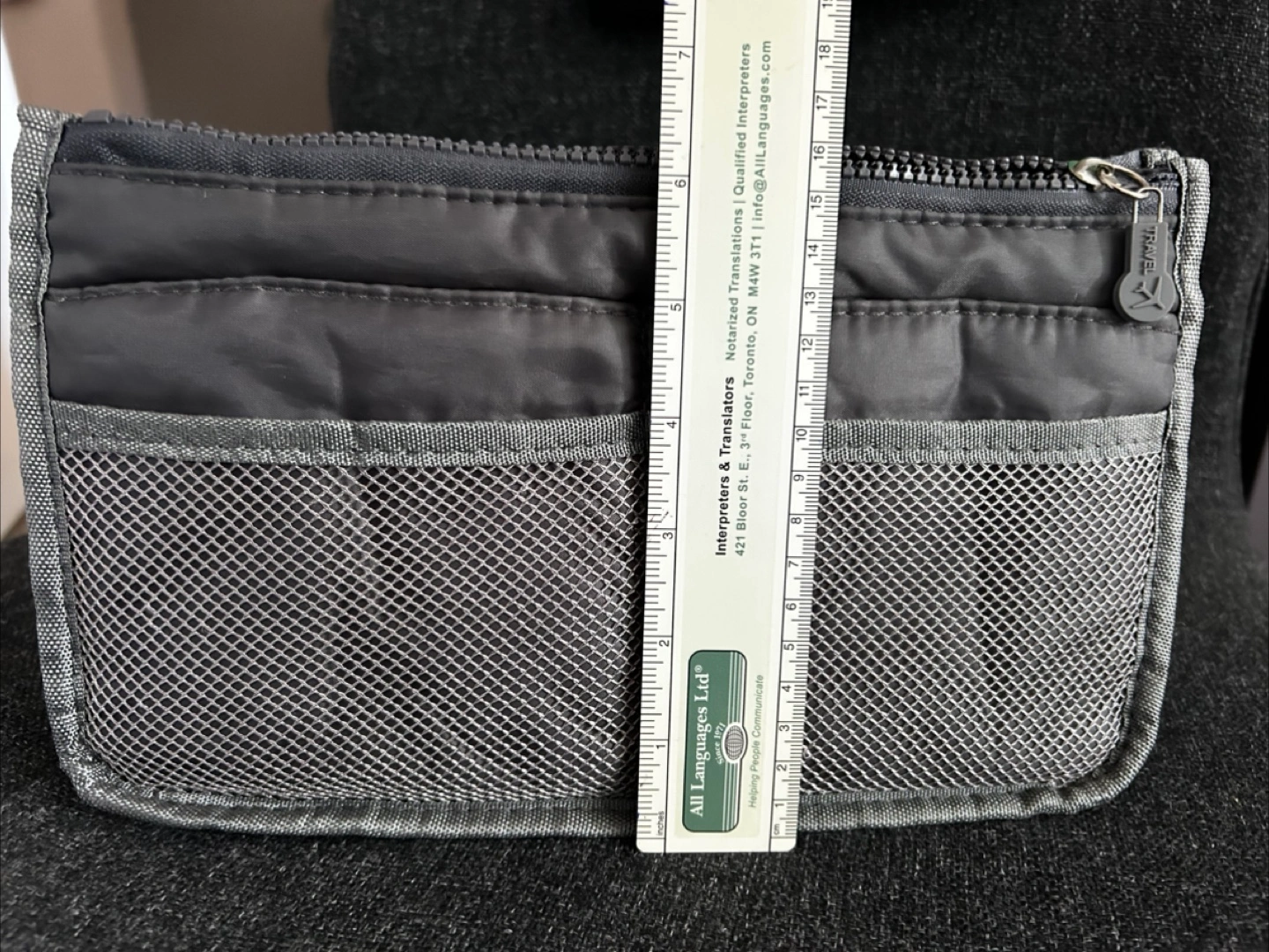 Useful for purse or bag that has only one hole. Declutter with this Travelon organizer! It's grey and has total of 13 pockets to keep everything in its place. It measures approximately 9 inches in length and 5 inches in height.