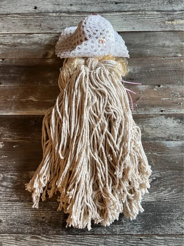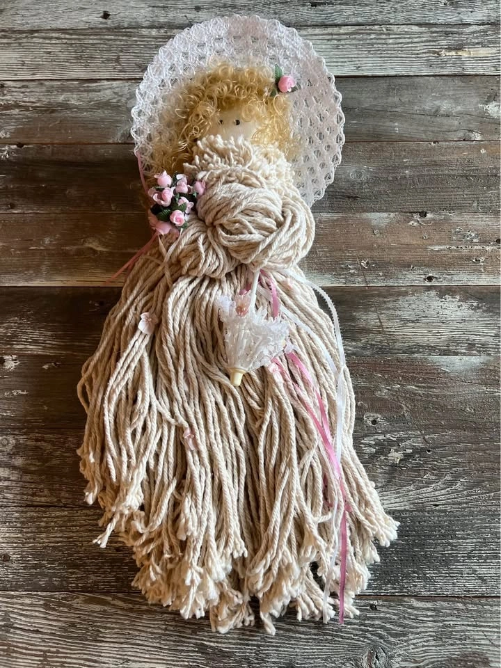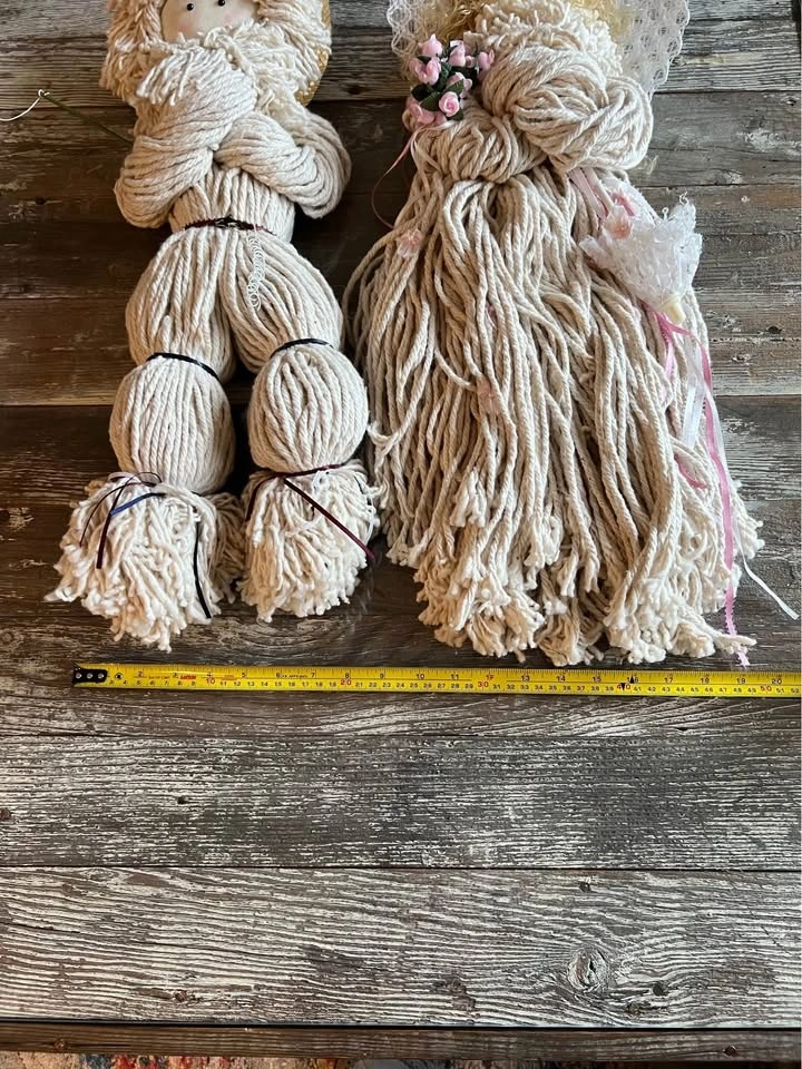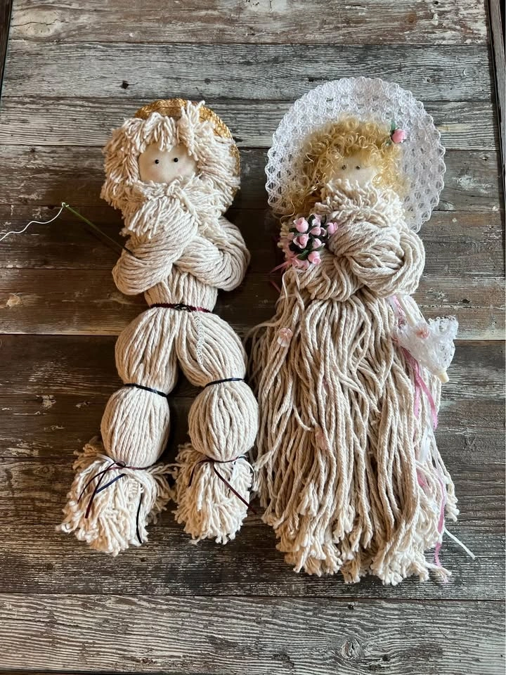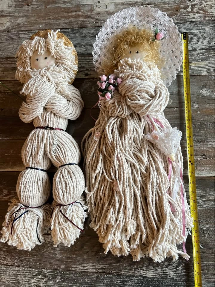 Charming Vintage Yarn Mop Dolls evoke the simplicity of country life. The set includes a boy and a girl, each adorned in quaint pink and white dresses, with the boy carrying a fishing rod and the girl an umbrella, both accessorized with straw hats and floral detail. At 24 inches by 9 inches, these handcrafted rag dolls are a delightful nod to farmhouse themes and folk art characters. With origins dating back to the 1970s, these Canadian-made treasures reflect a era of handmade crafts and grandmothers' loves. The dolls feature a light complexion, black eyes, and white hair, capturing the essence of rustic childhood adventures. Perfect for a bathroom or hallway display, this duo brings a touch of nostalgia and a cheerful vibe to any space. Dolls are in very good condition, a couple little things. Umbrella is a bit frazzled but you can’t tell (easy fix with hot glue gun if one had to do it) girls hat is a bit loose but still staying on fine and ounce again easy fix if one was so inclined.
