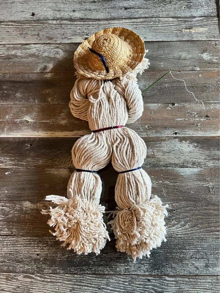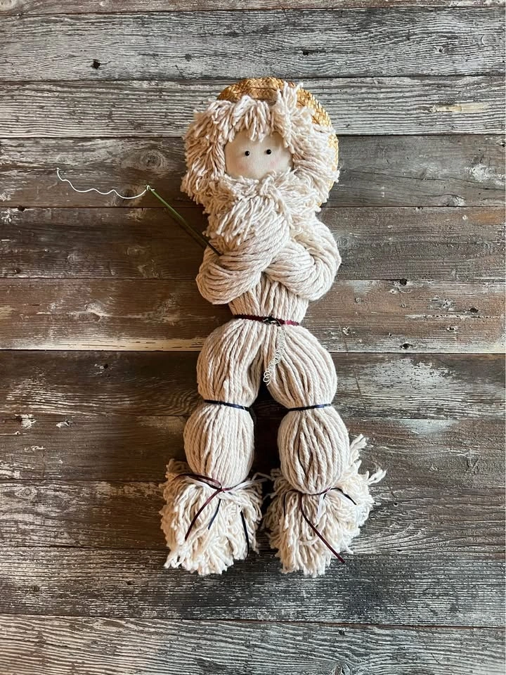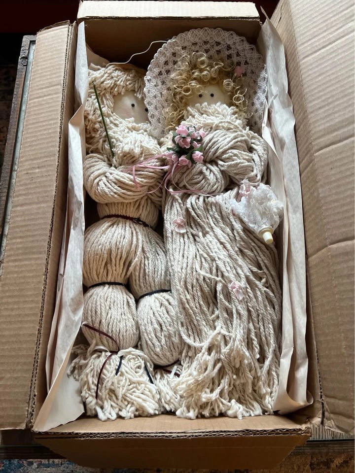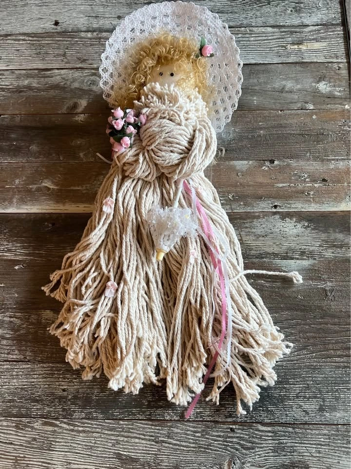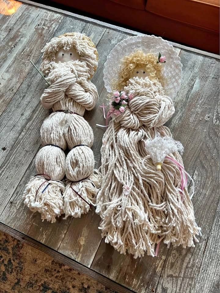 Charming Vintage Yarn Mop Dolls evoke the simplicity of country life. The set includes a boy and a girl, each adorned in quaint pink and white dresses, with the boy carrying a fishing rod and the girl an umbrella, both accessorized with straw hats and floral detail. At 24 inches by 9 inches, these handcrafted rag dolls are a delightful nod to farmhouse themes and folk art characters. With origins dating back to the 1970s, these Canadian-made treasures reflect a era of handmade crafts and grandmothers' loves. The dolls feature a light complexion, black eyes, and white hair, capturing the essence of rustic childhood adventures. Perfect for a bathroom or hallway display, this duo brings a touch of nostalgia and a cheerful vibe to any space. Dolls are in very good condition, a couple little things. Umbrella is a bit frazzled but you can’t tell (easy fix with hot glue gun if one had to do it) girls hat is a bit loose but still staying on fine and ounce again easy fix if one was so inclined.