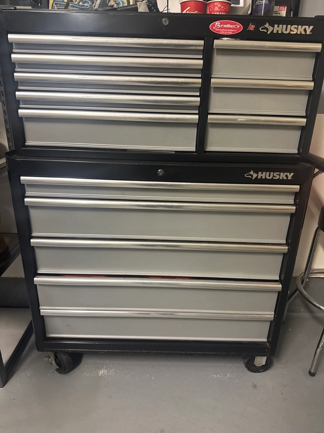 Selling a Husky tool chest, perfect for organizing your tools! It's black with grey drawers and has a good amount of storage space. Great for any garage or workshop
