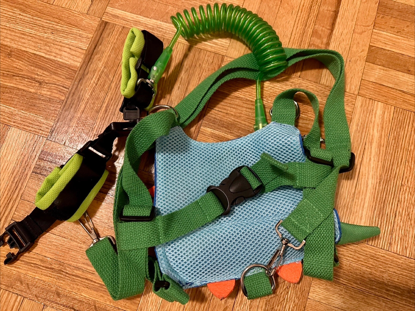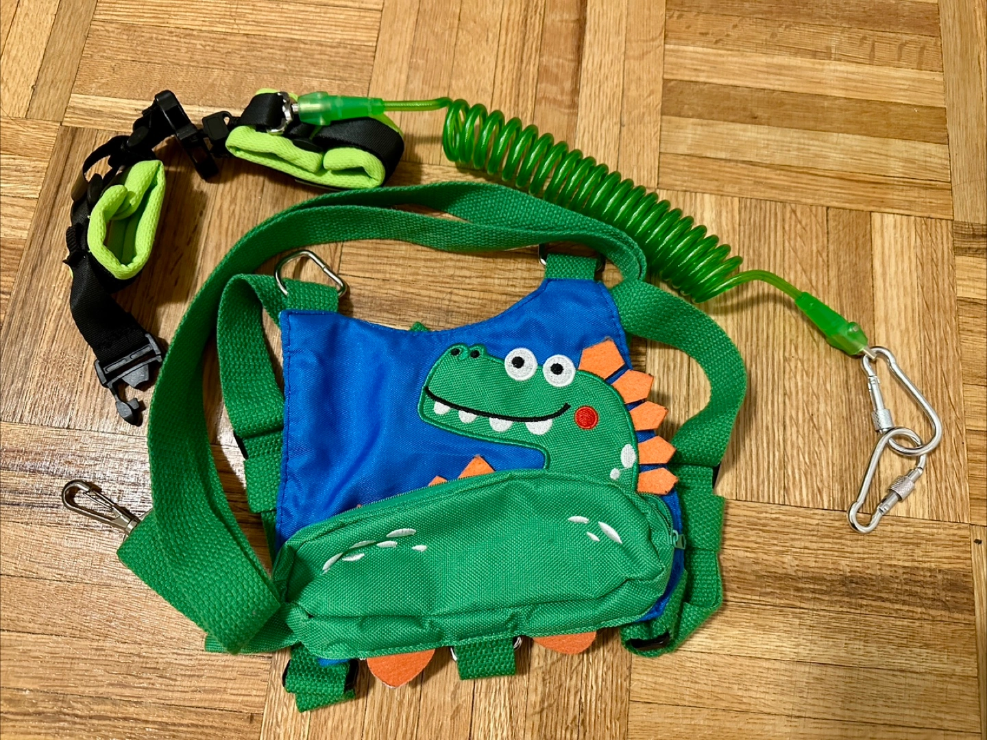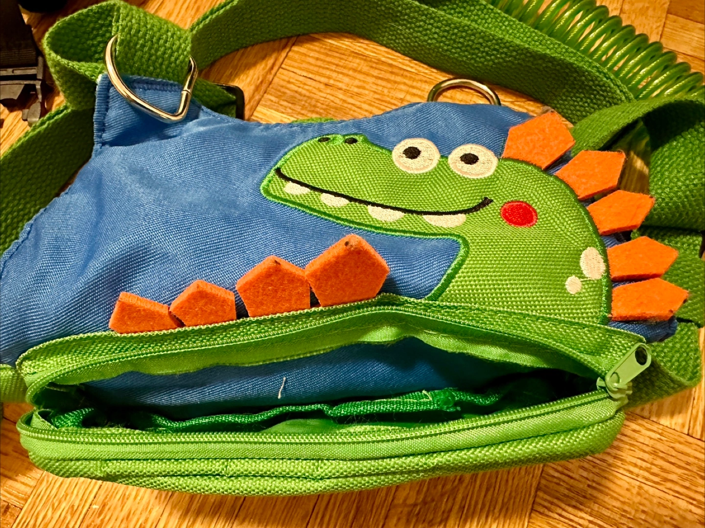 207This adorable dinosaur backpack is perfect for keeping your little one safe and close! It comes with a detachable leash, so you can keep them from wandering off in crowded places. The backpack is blue and green with a cute dinosaur design. It also has a small zippered compartment for carrying snacks or small toys. pick up only!