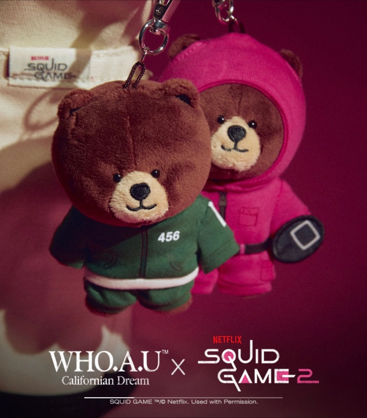 These adorable bear plush keychains are from the WHO.A.U x Squid Game collaboration! One is wearing the iconic green tracksuit with the number 456, and the other is in the pink guard uniform. Perfect for adding a touch of Squid Game to your keys or bag!