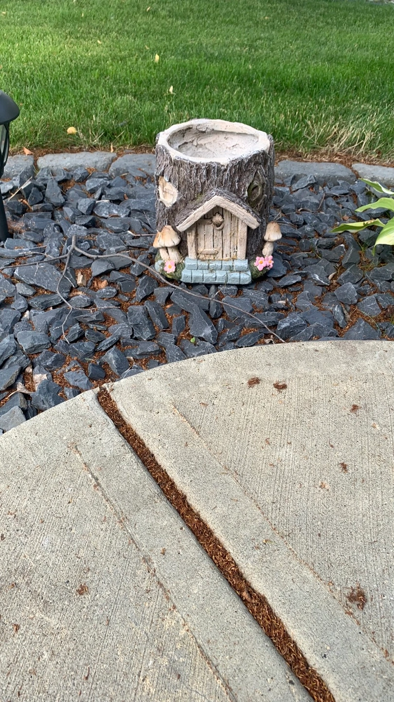 This is a cute tree stump shaped planter with a fairy house attached. It would look great in any garden or on a patio!