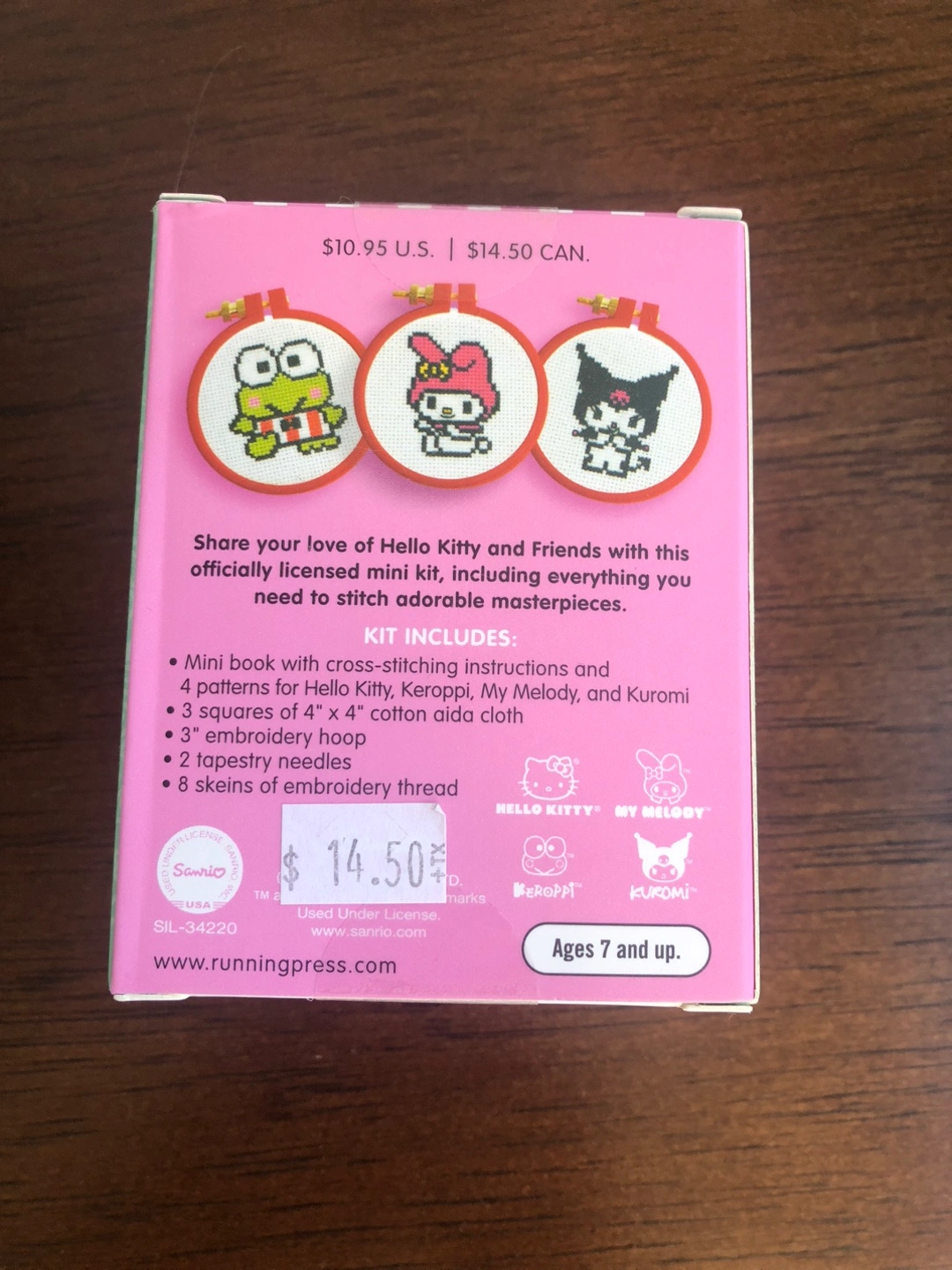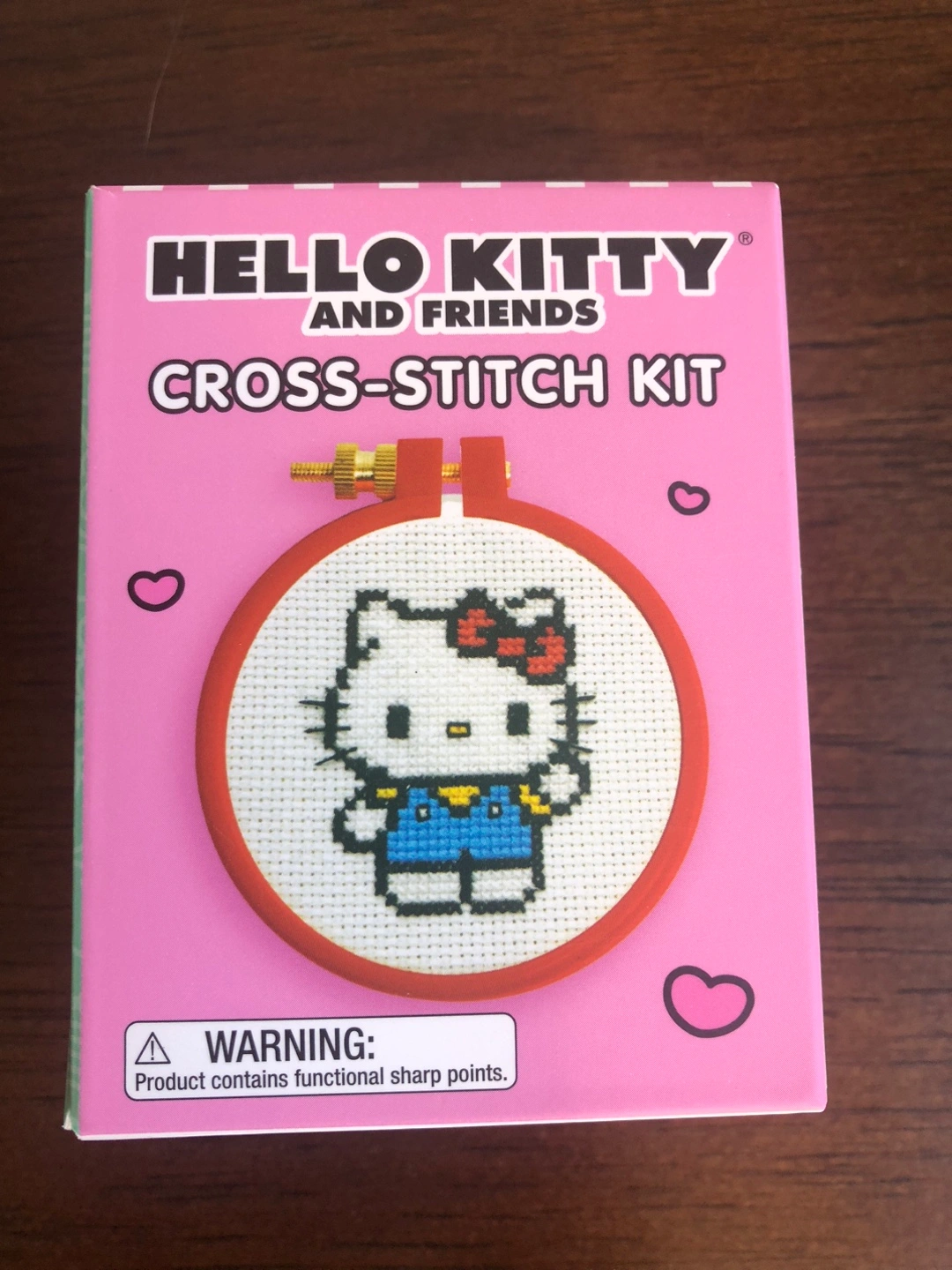 419Get crafty with this Hello Kitty and Friends cross-stitch kit! It includes everything you need to stitch adorable masterpieces. Kit Includes: - Mini book with cross-stitching instructions and 4 patterns for Hello Kitty, Kerroppi, My Melody, and Kuromi - 3 squares of 4" x 4" cotton aida cloth - 3" embroidery hoop - 2 tapestry needles - 8 skeins of embroidery thread Ages 7 and up