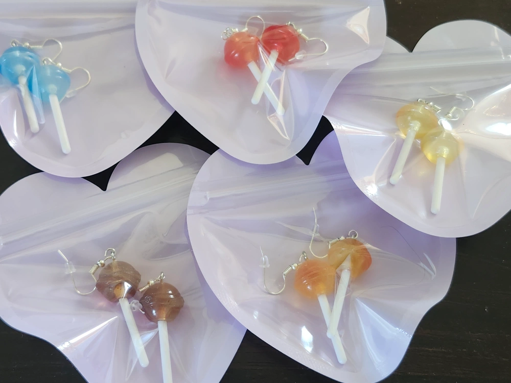 65Check out these adorable lollipop earrings! They come in a variety of colours, including blue, red, yellow, brown, and orange. Each pair is individually packaged in a cute heart-shaped bag. These earrings are sure to add a sweet touch to any outfit!