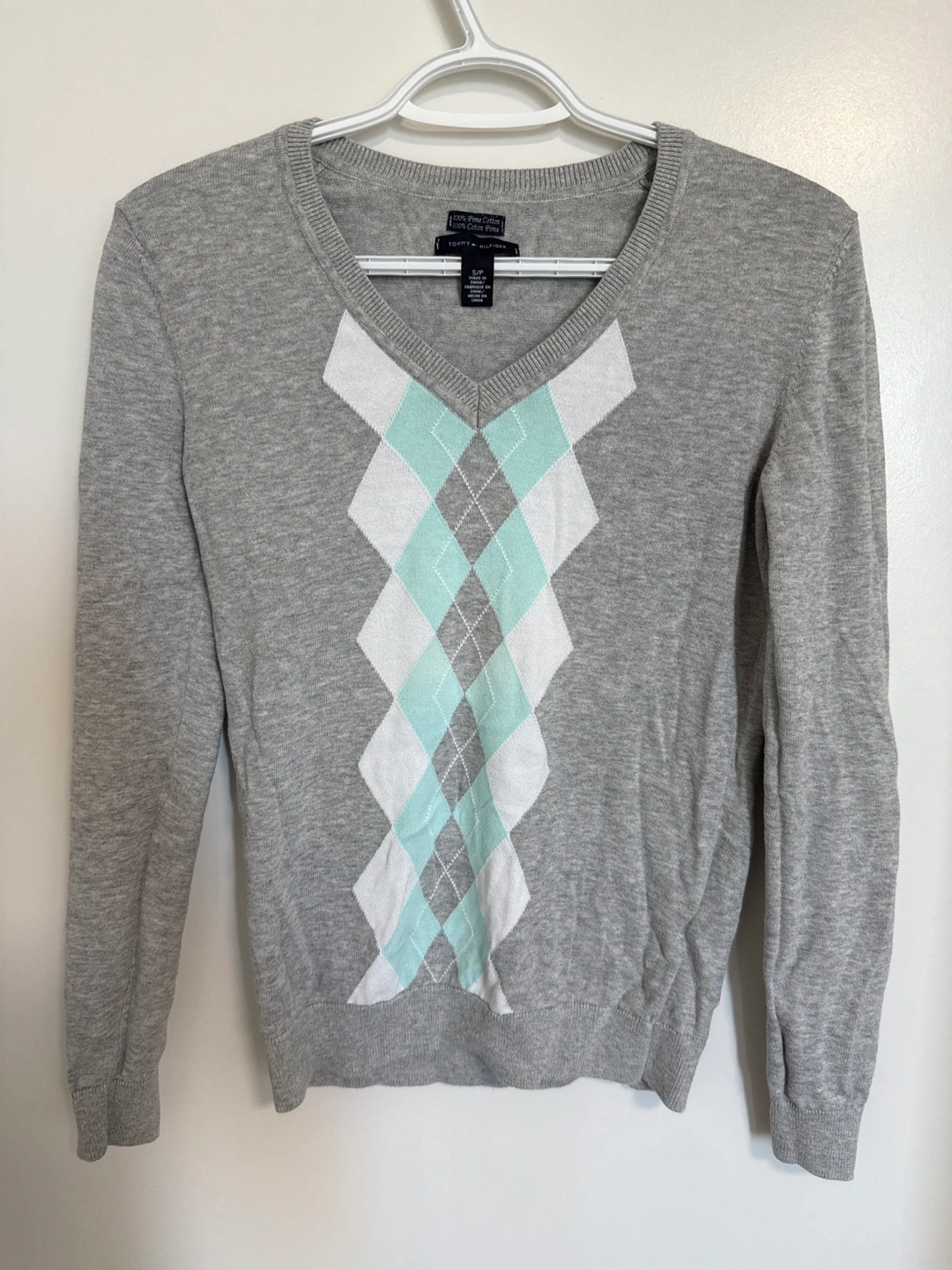 Here's a Tommy Hilfiger sweater in size small! It's a light grey colour with an argyle pattern. Perfect for layering or wearing on its own!