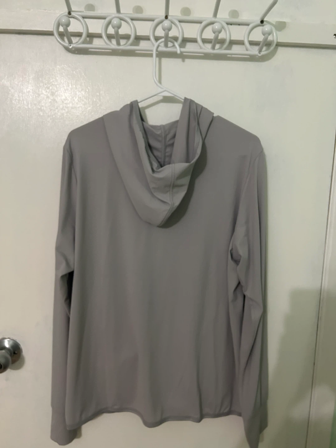 Selling a light gray athletic hoodie. It's in great shape and ready for your workouts or casual wear. The size isn't marked, so please check the photos to see if it's the right fit for you! It features a comfortable hood and a full zipper.
