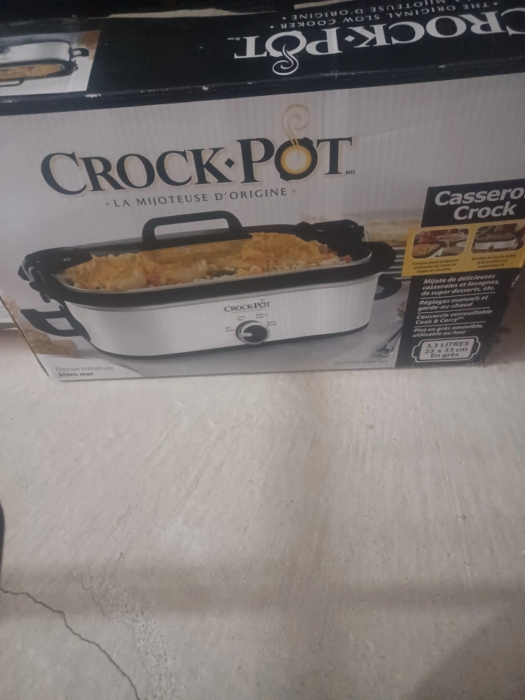 9I'm selling a Crock-Pot Casserole Crock slow cooker! This slow cooker is perfect for making delicious casseroles, lasagnas, and desserts. It features manual settings and a keep-warm function. The stoneware pot is removable and easy to clean. It has a metallic white finish, and its capacity is 3.3 litres with dimensions of 23 x 33 cm
