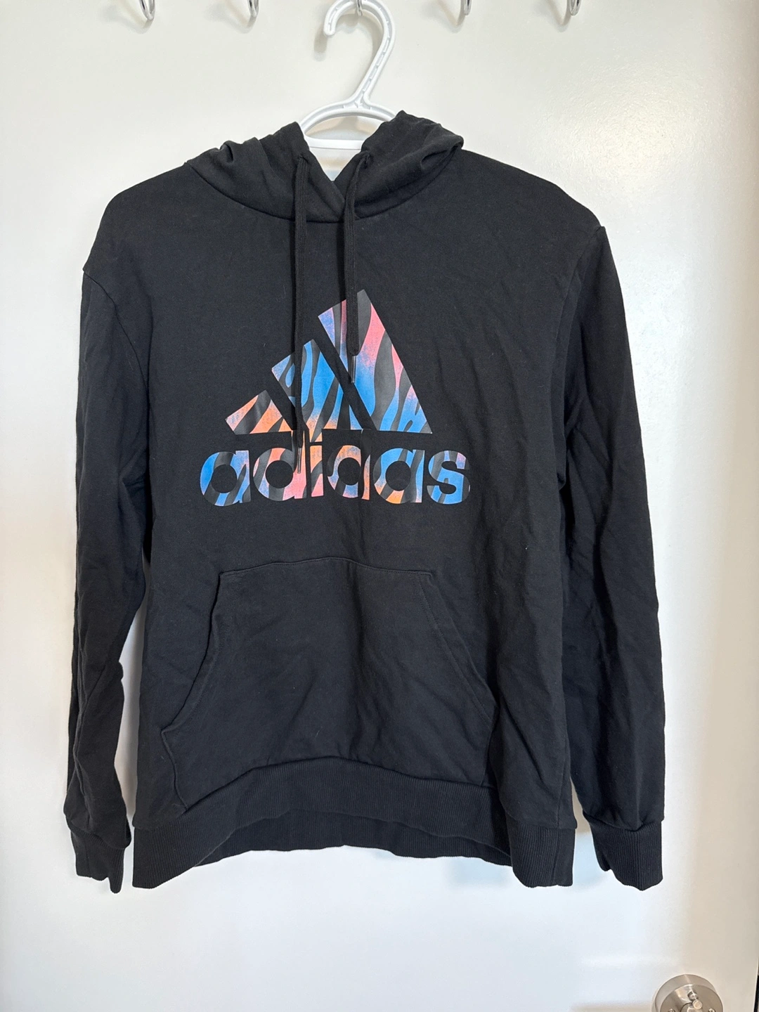 Selling a black Adidas hoodie. It has a cool, colourful logo on the front. Perfect for staying cozy!