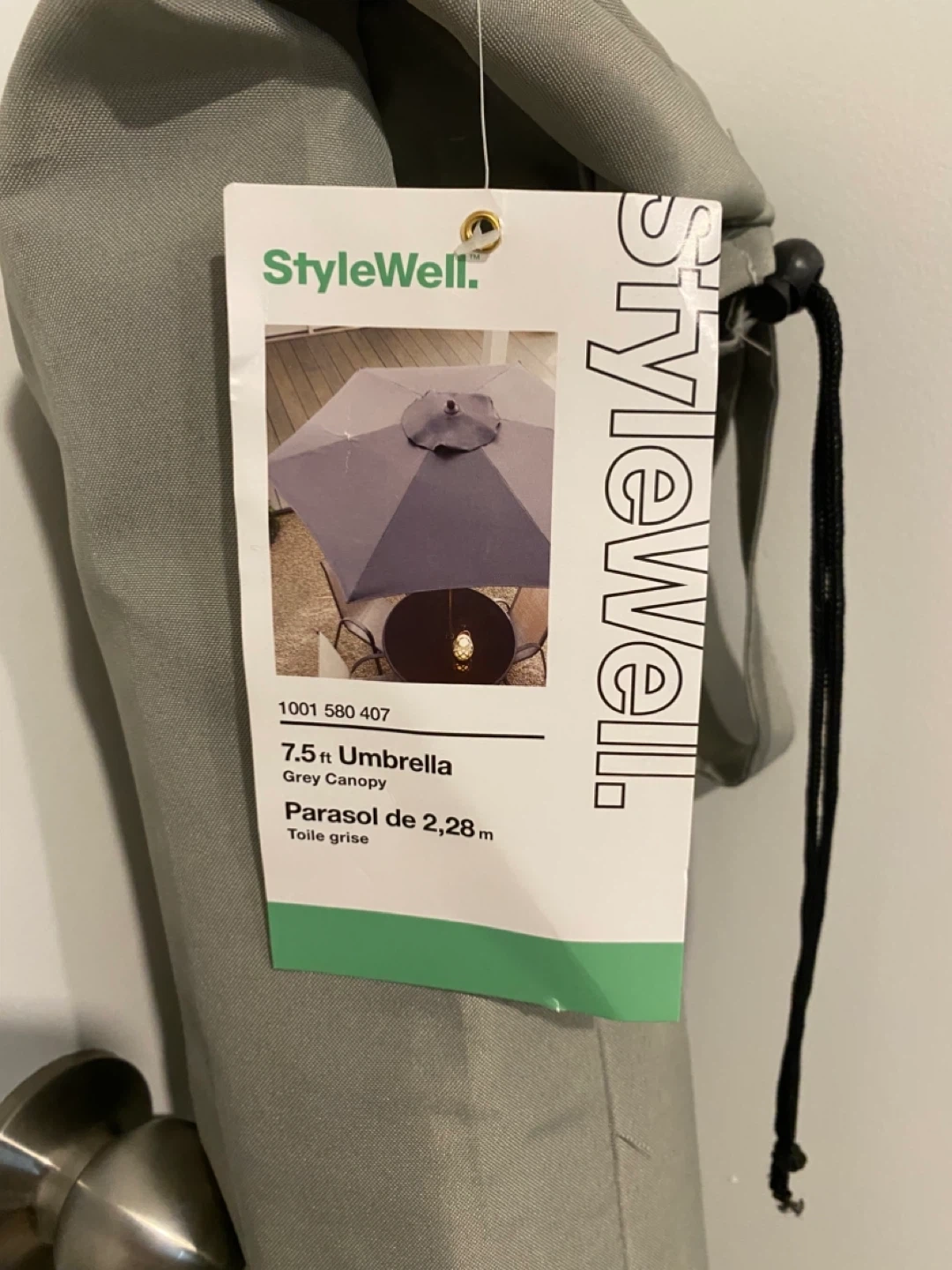 Selling a StyleWell 7.5 ft umbrella with a grey canopy.