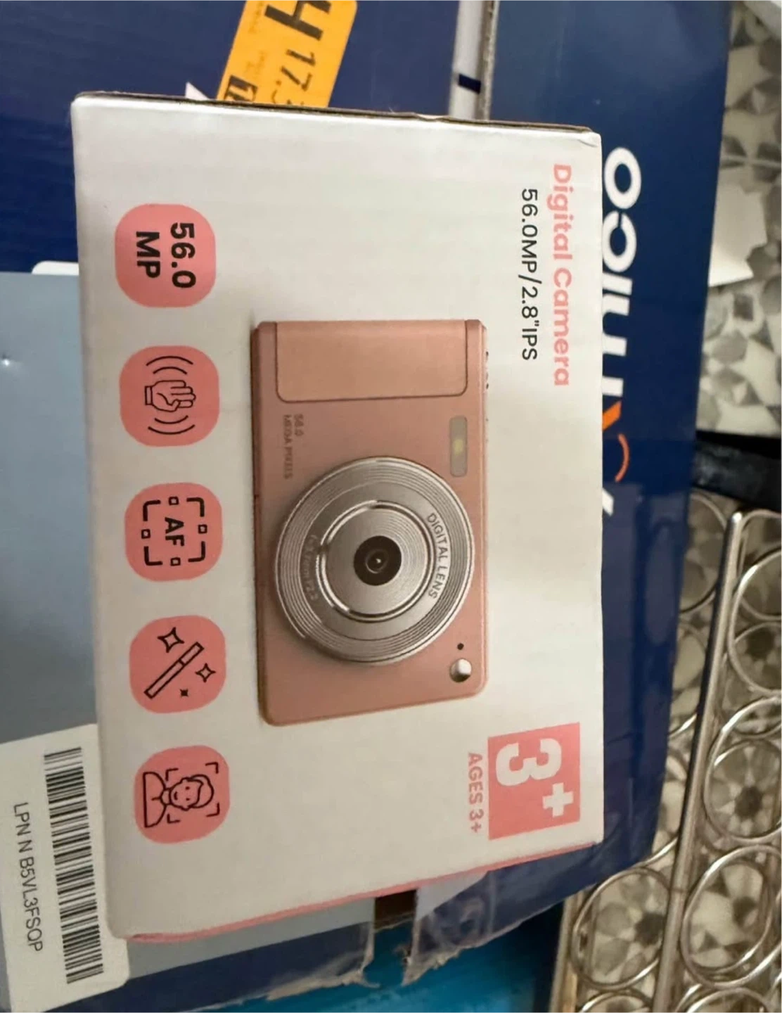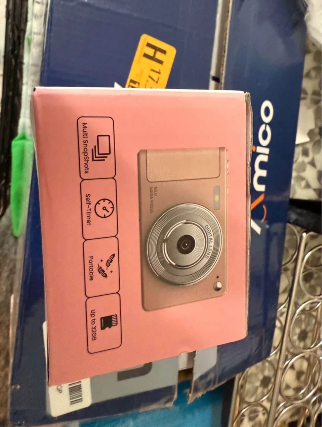 Selling a brand new Amico digital camera! It's 56.0 megapixels and has a 2.8" IPS screen. It's suitable for ages 3+. The box includes features like multi snapshots, a self-timer, and it's portable. It also supports up to 32GB.