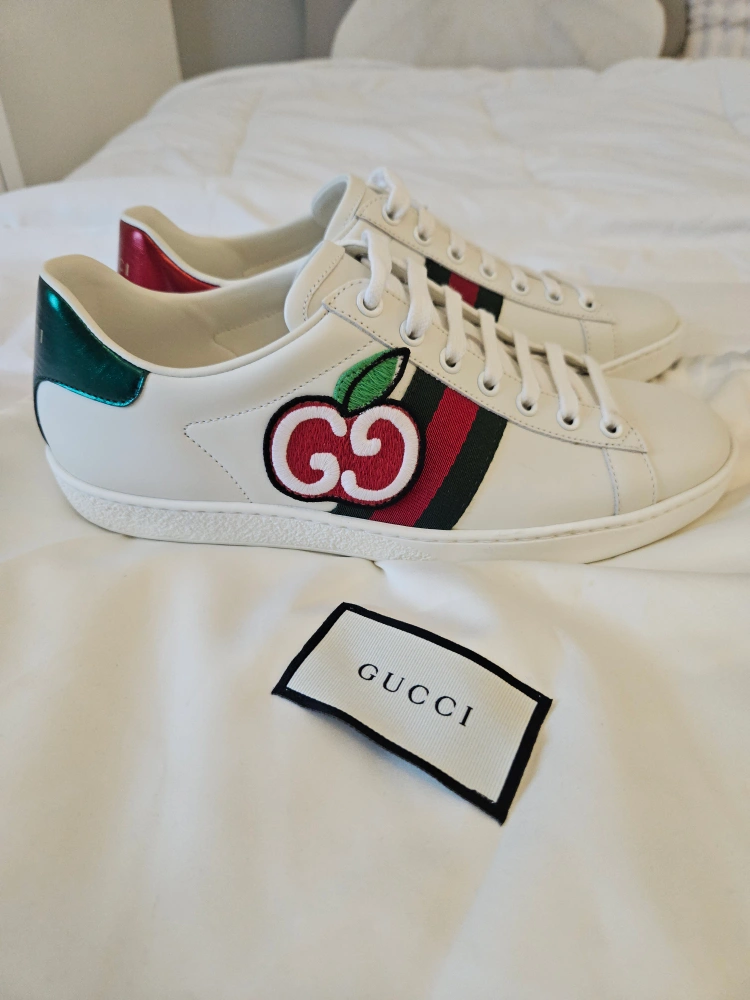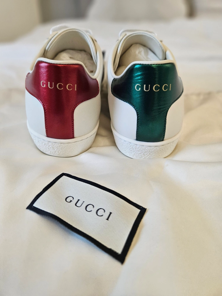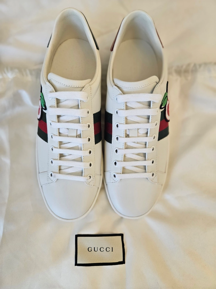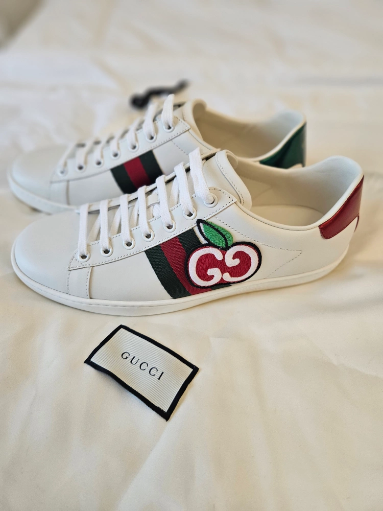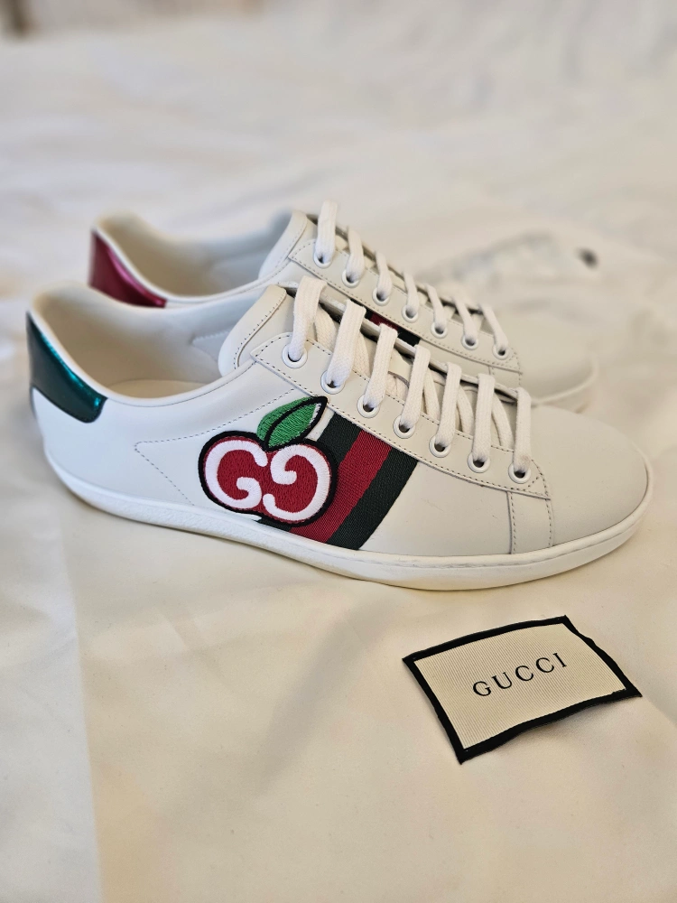 60These Gucci Ace sneakers feature the iconic green and red web stripe and a cute cherry patch! The backs are different colours - red and green! They are in great condition and come with a Gucci dust bag