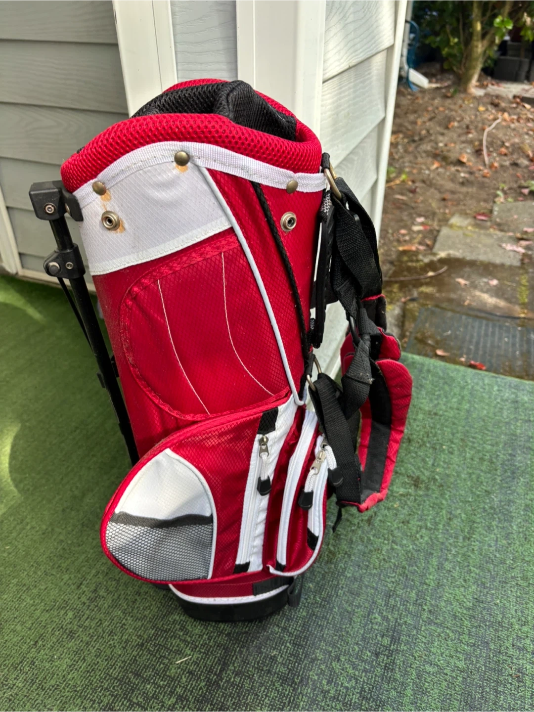 Selling a used Atom golf stand bag in red and white. It's in good condition and ready for the golf course