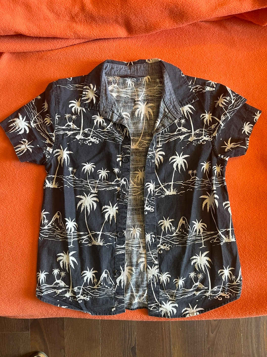 A fun shirt with a palm tree print! Perfect for summer vibes or a casual day out. The material is lightweight and breathable, making it super comfy for warm weather Size 6-7 kids