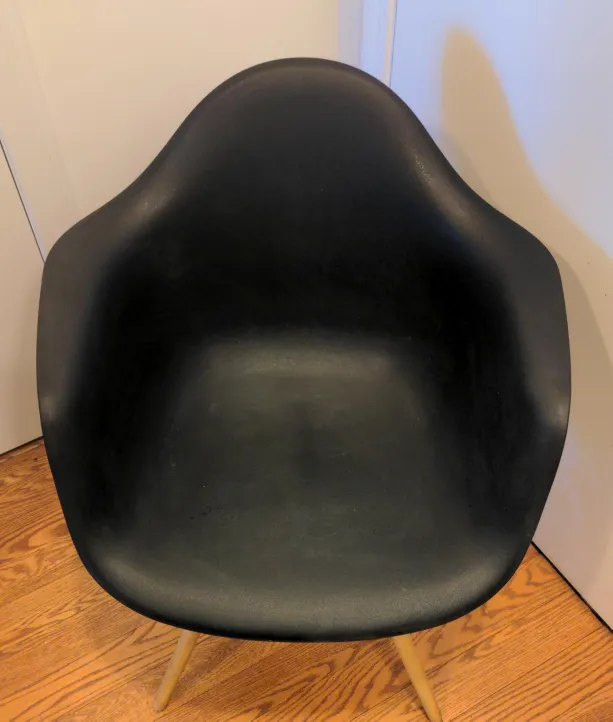 Selling a black Eames-style shell chair. It's in good condition and would be a great addition to any room! The chair has a classic design with a black shell and wooden legs.