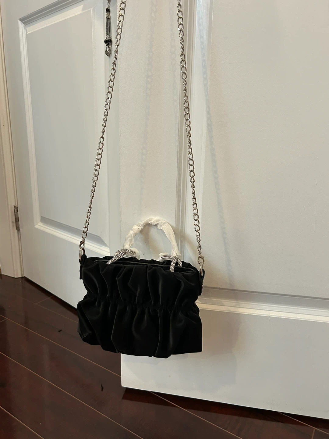 218This is a cute black velvet bag with a chain strap. It's in brand new and perfect for a night out or a special occasion. The ruching detail adds a touch of elegance, and the chain is nice and sturdy