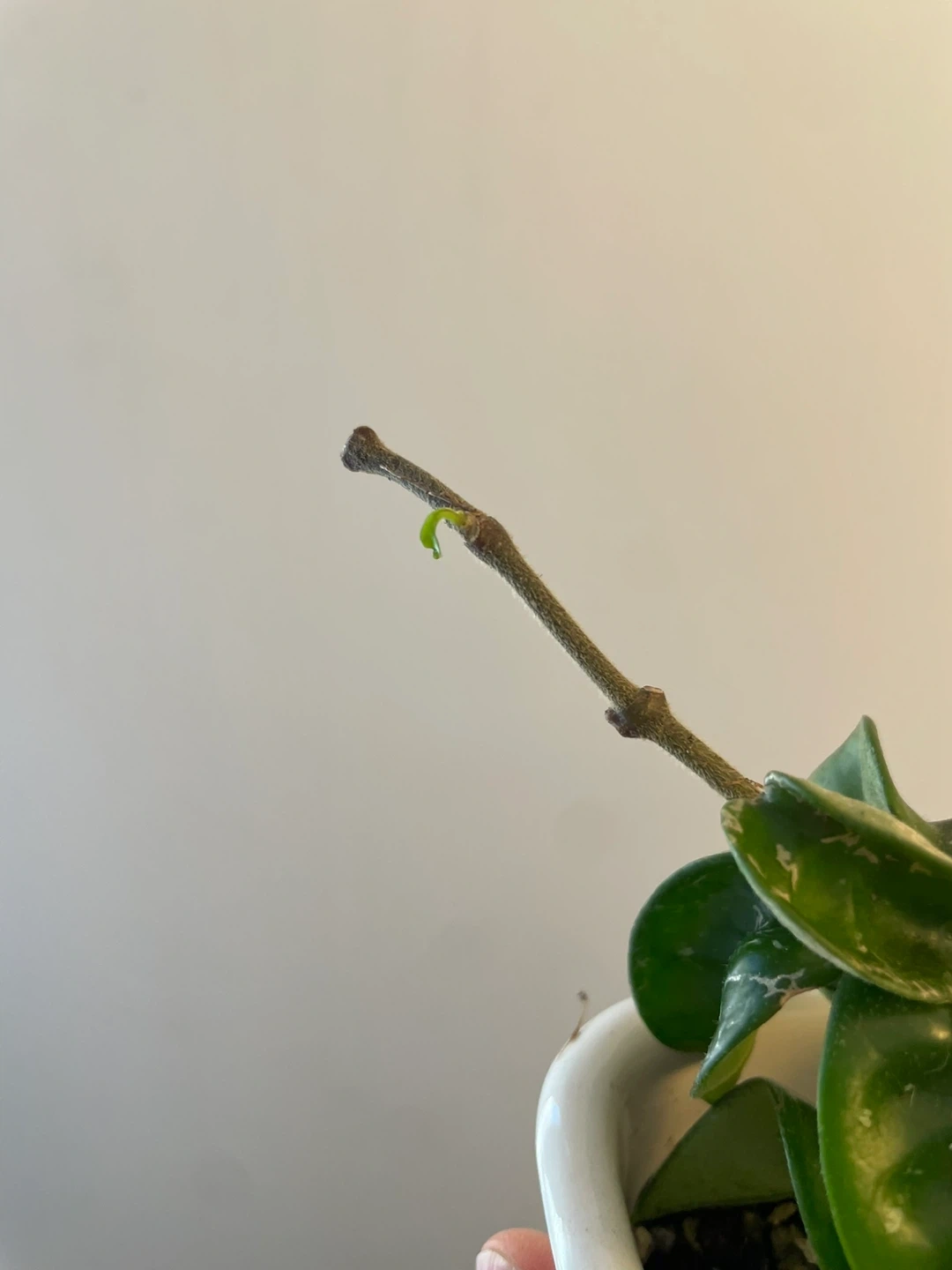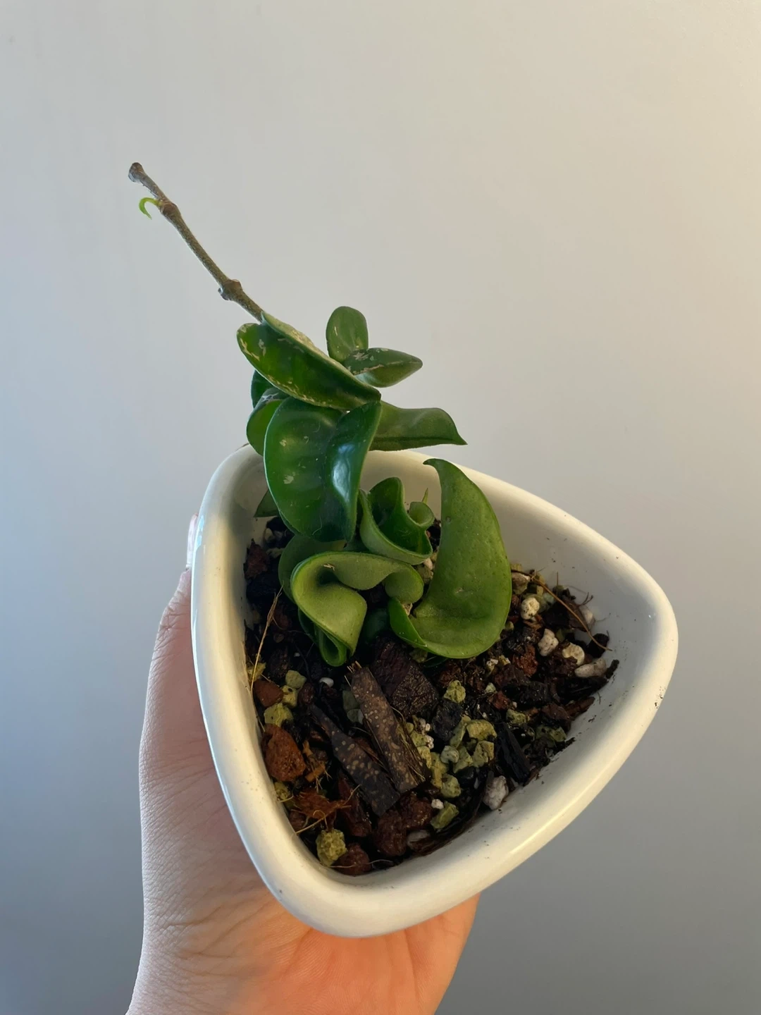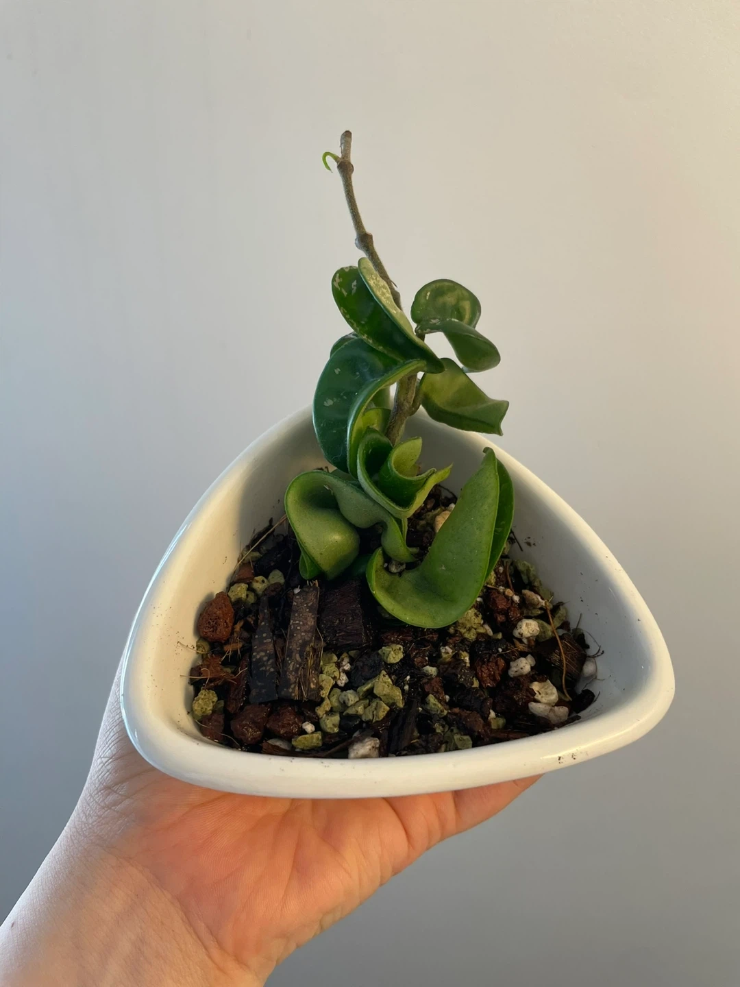 Selling a cute Hoya Carnosa Compacta plant! It's a beautiful, easy-to-care-for houseplant that would look great in any home. The leaves are a lovely, deep green and have a unique, twisted shape. It comes in a white triangular pot.